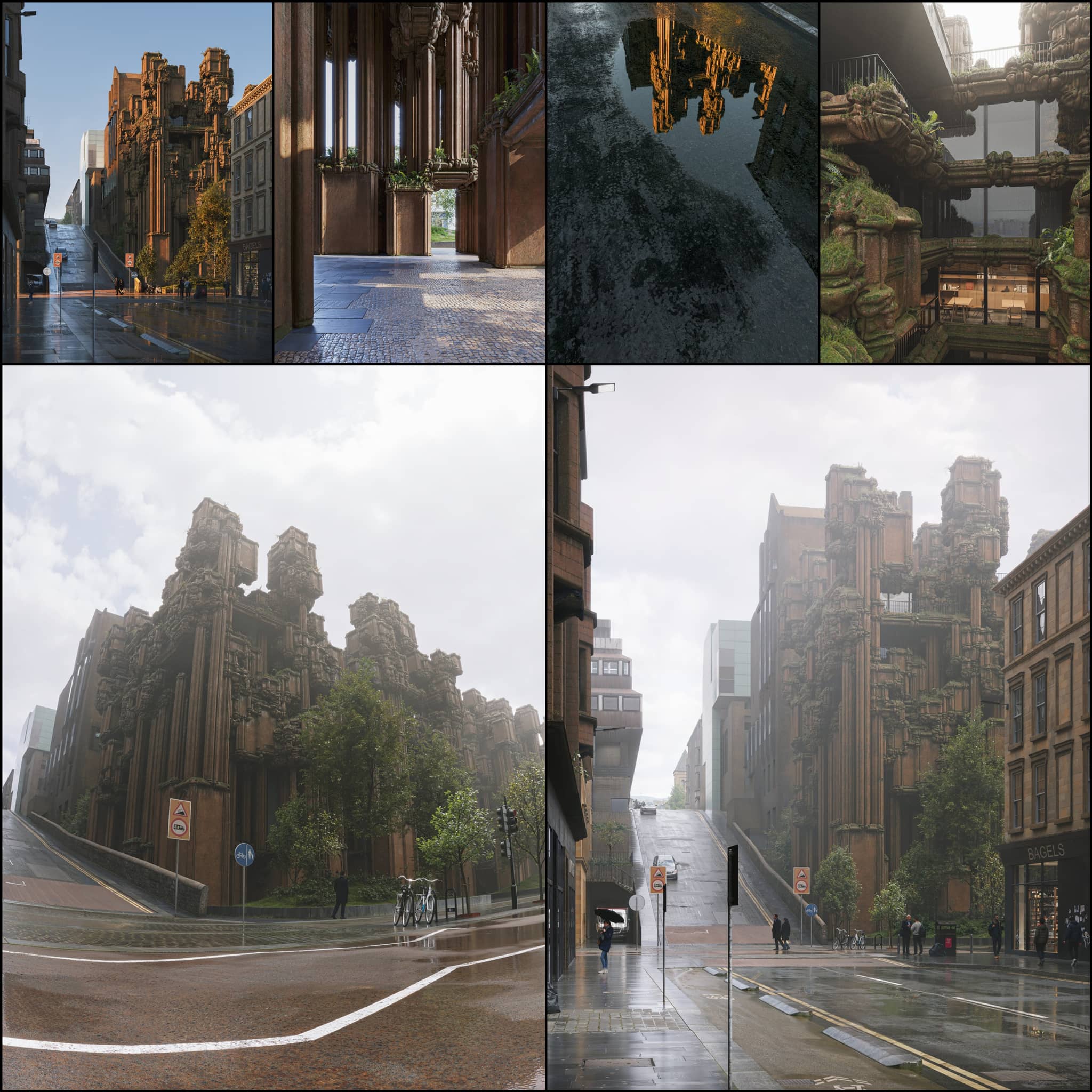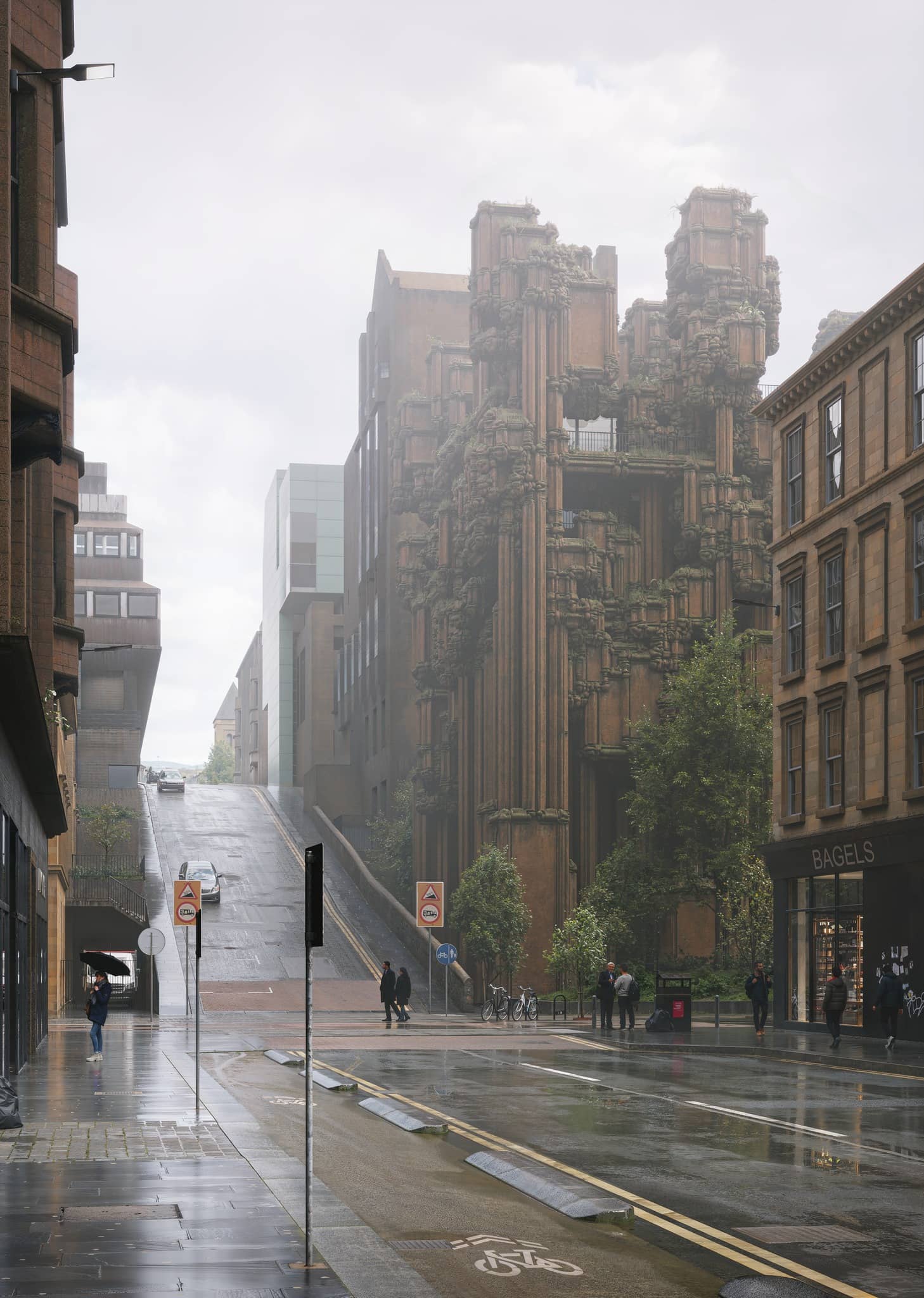 This conceptual proposal by architect Barry Wark reimagines one of Glasgow’s central sites as an “urban cliff,” designed to naturally weather and become overgrown over time.