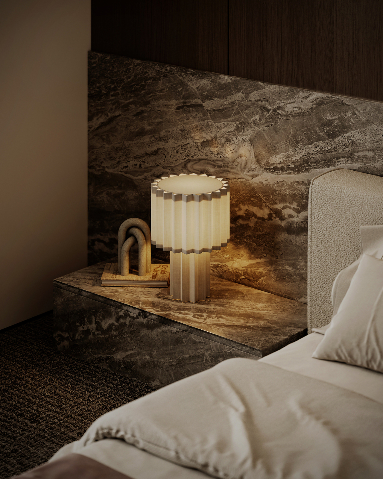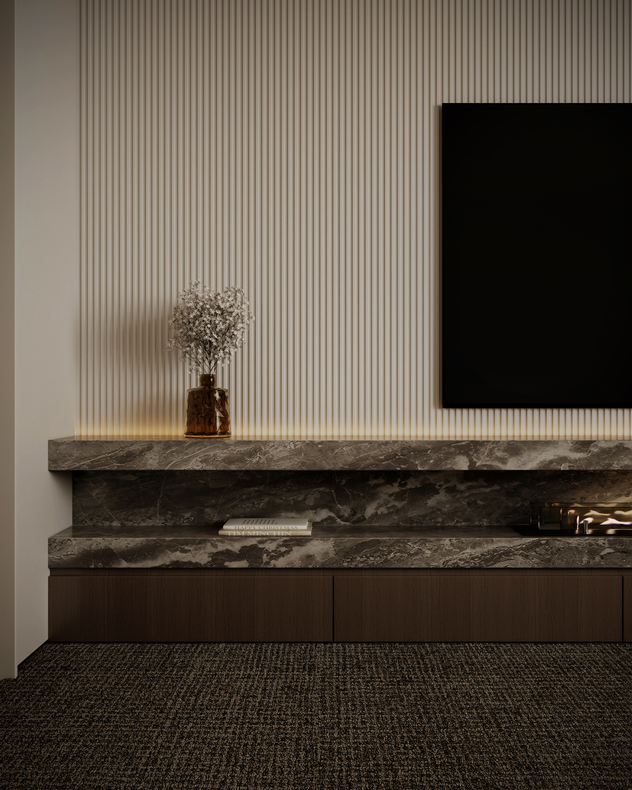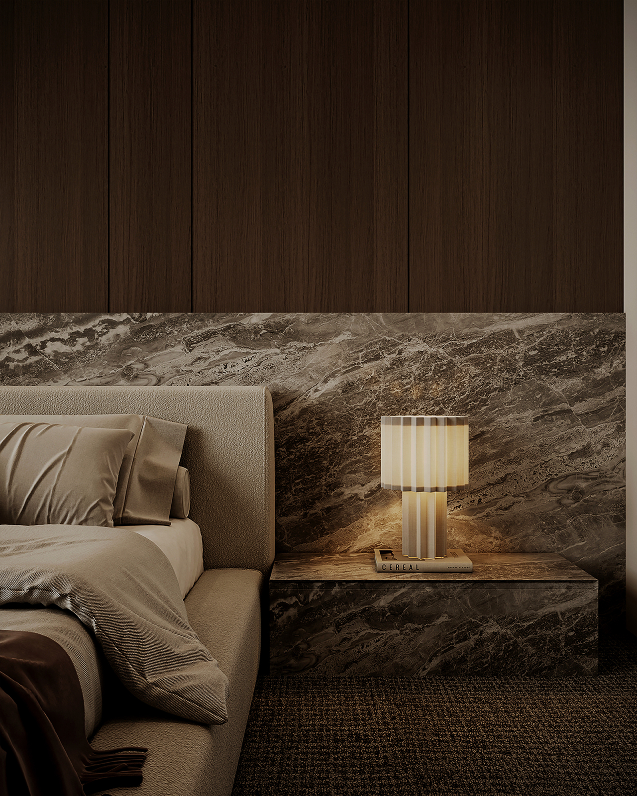 Where soft tones meet bold textures: a master bedroom wrapped in warm wood and striking marble for a dramatic modern escape.