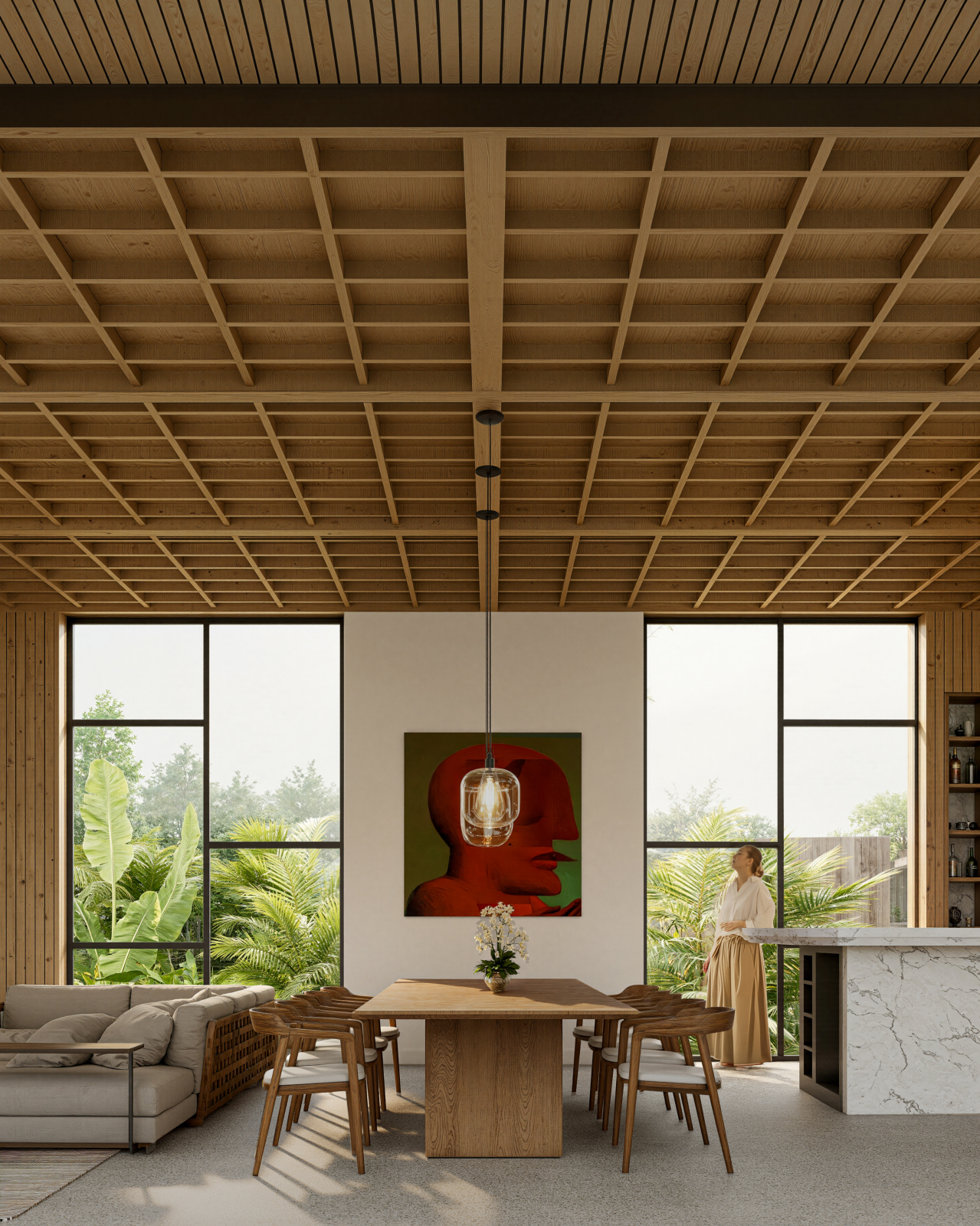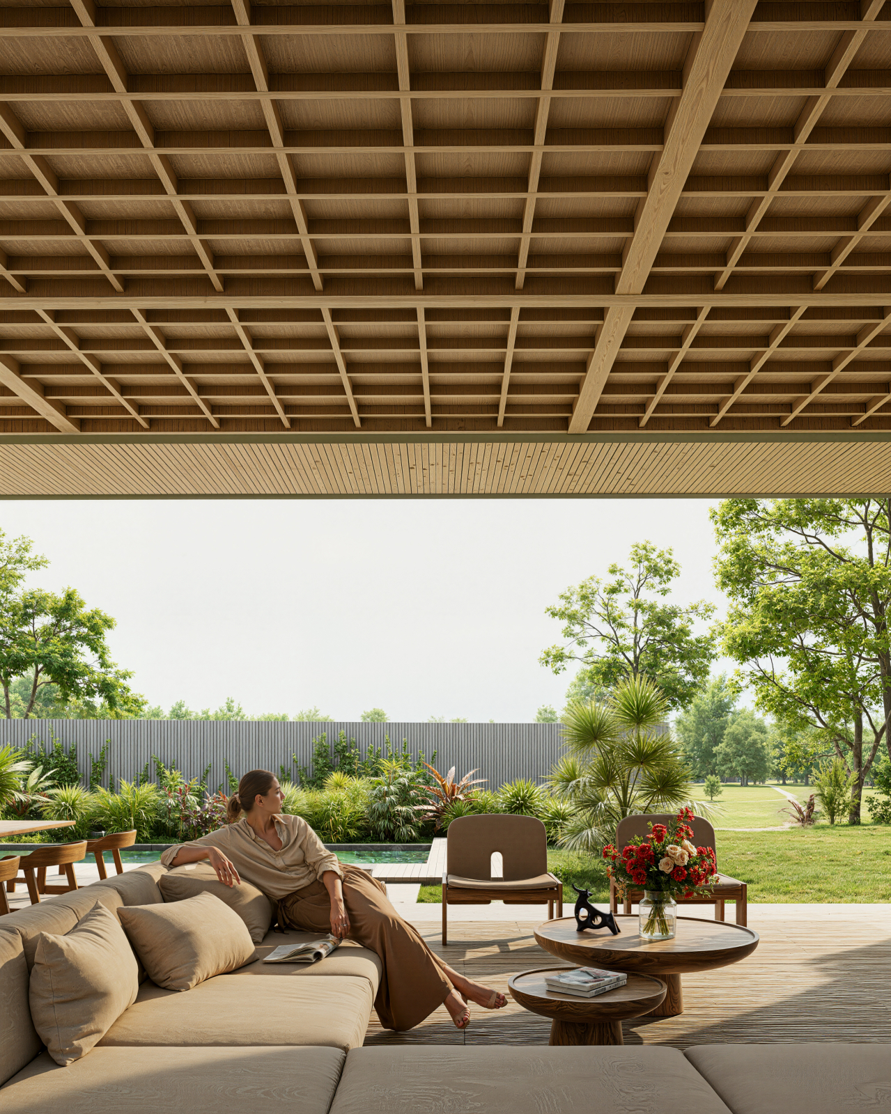 A serene and welcoming atmosphere, where every detail , from the texture of the wood to the arrangement of the furniture , contributes to a harmonious and contemporary spatial experience.