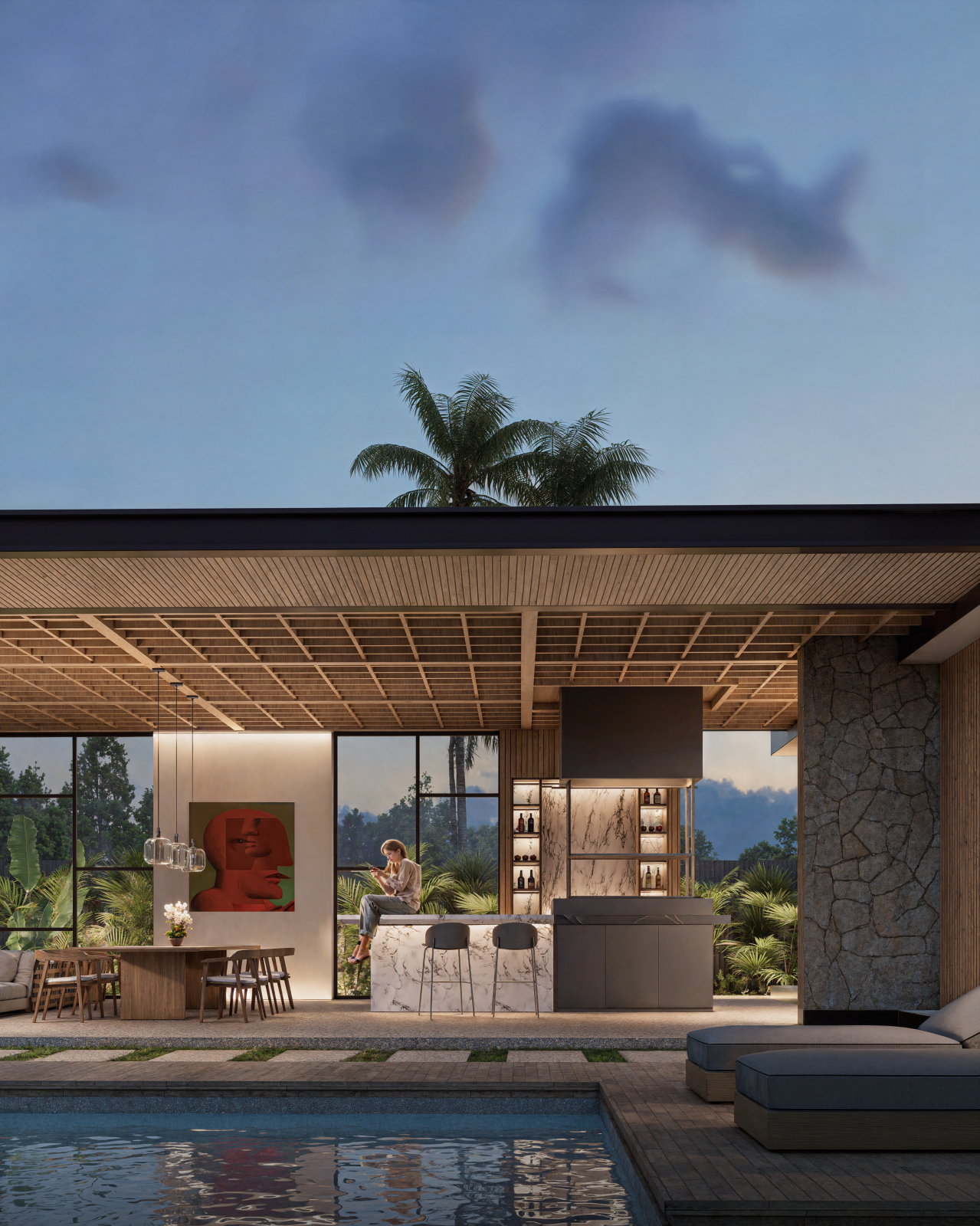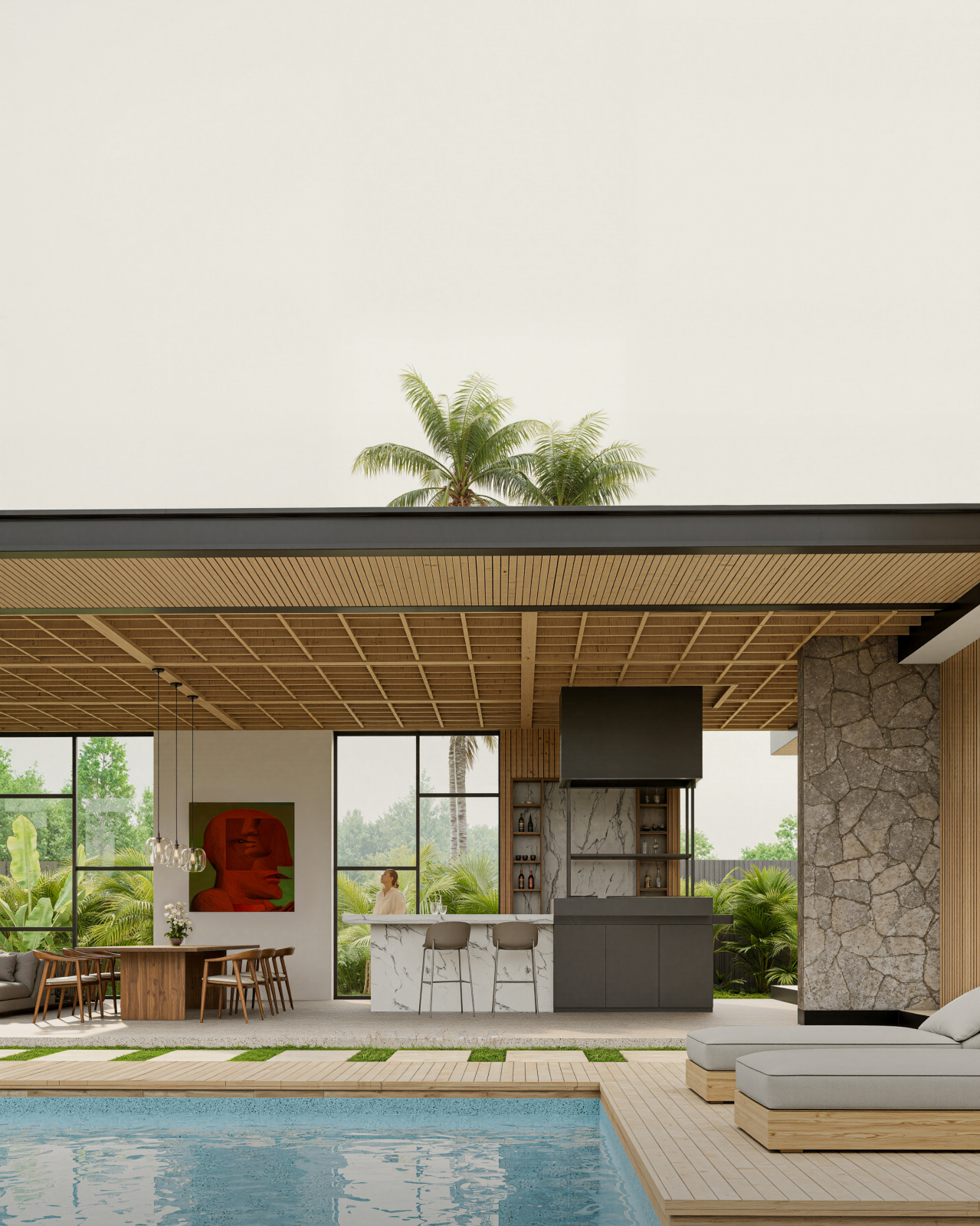Exterior render of a modern villa surrounded by tropical greenery. Natural light highlights materials, volumes, and the indoor–outdoor flow, conveying a fresh and contemporary lifestyle.