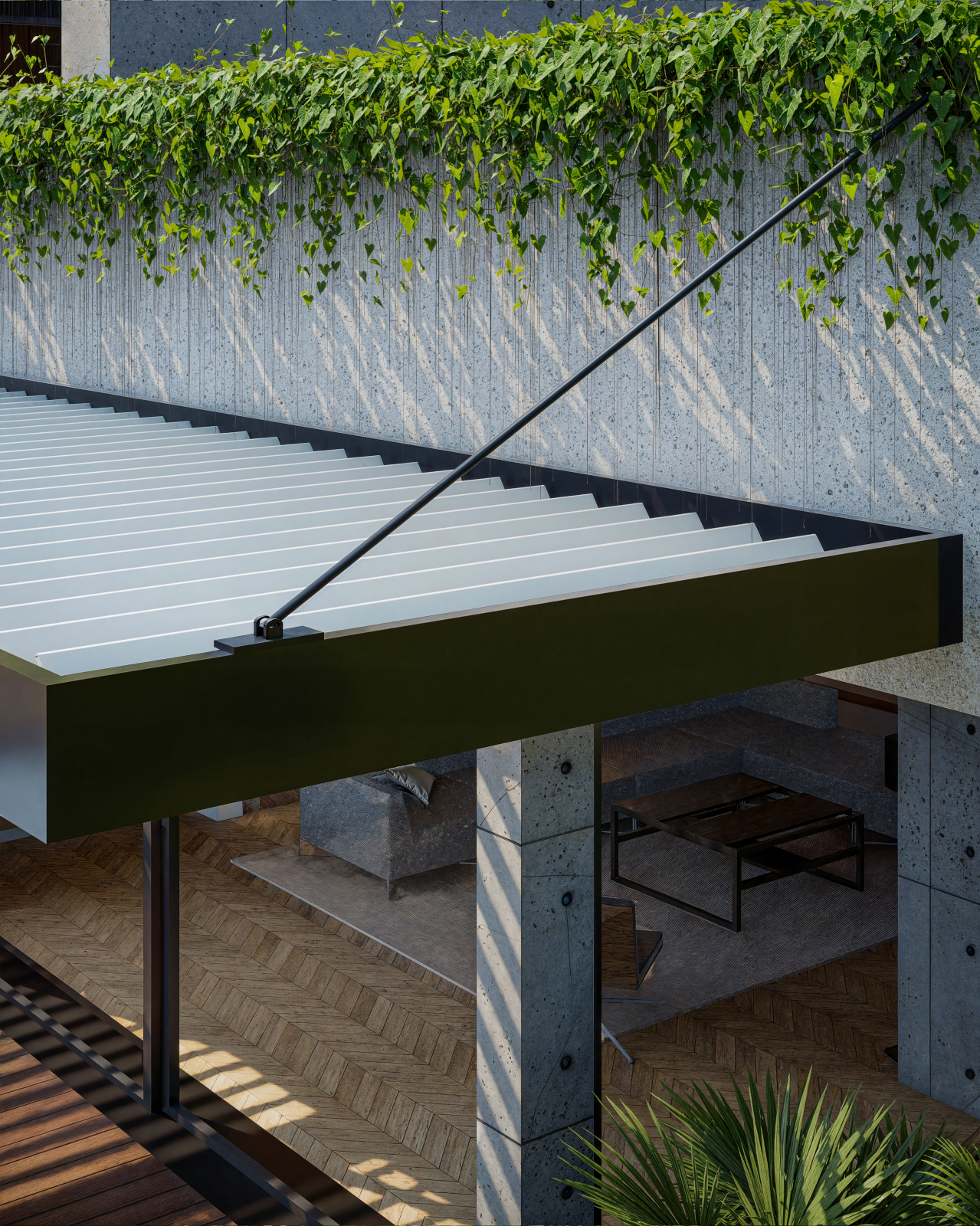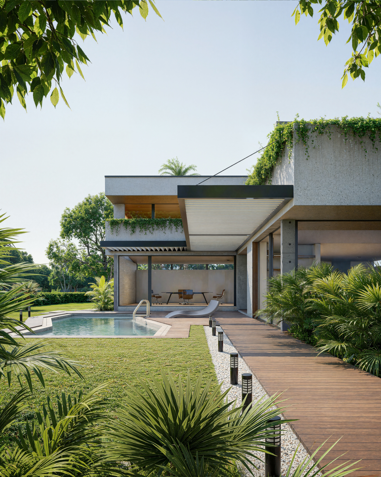 Exterior render of a modern villa surrounded by tropical greenery. Natural light highlights materials, volumes, and the indoor–outdoor flow, conveying a fresh and contemporary lifestyle.