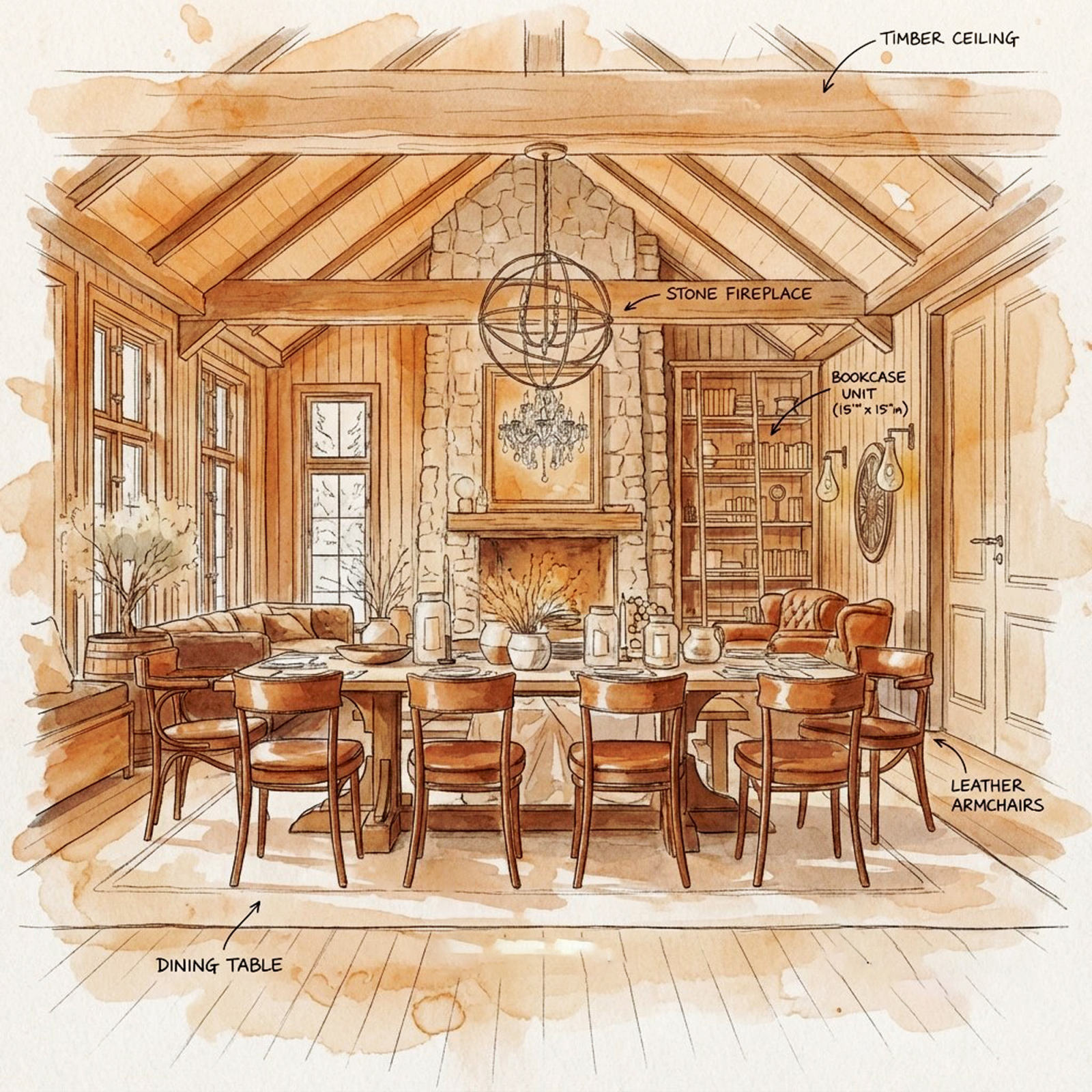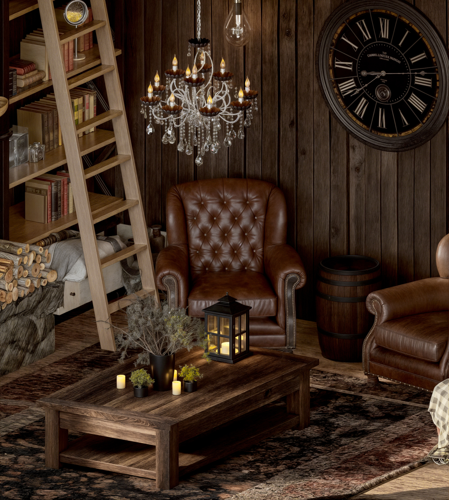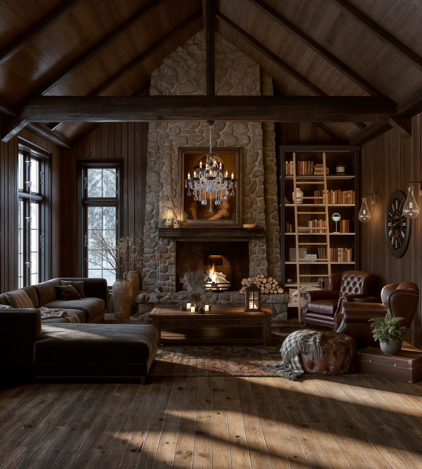 Warm rustic living space with dark wood interiors, stone fireplace, soft natural light, and a cozy cinematic atmosphere