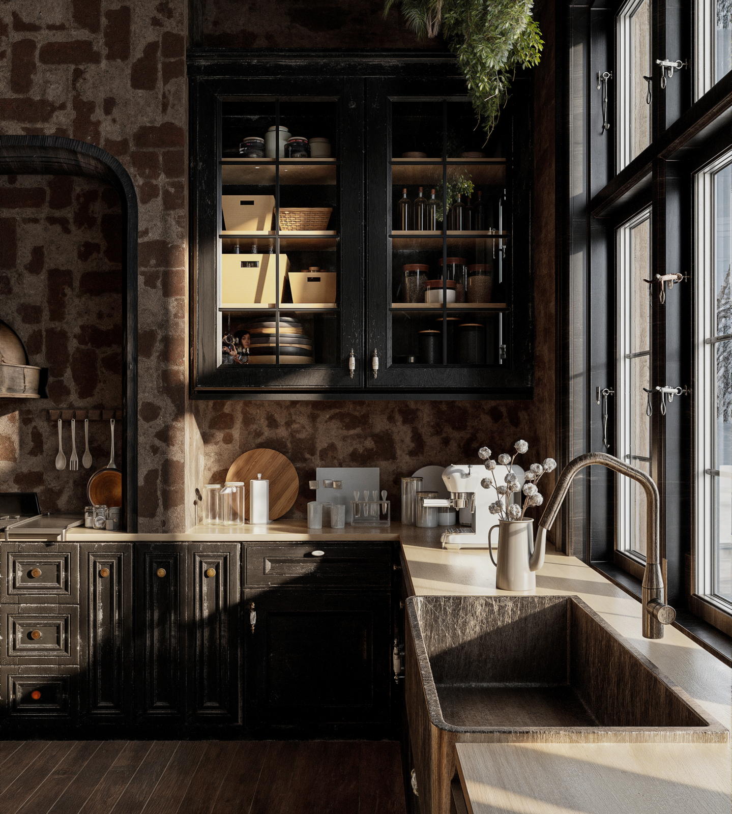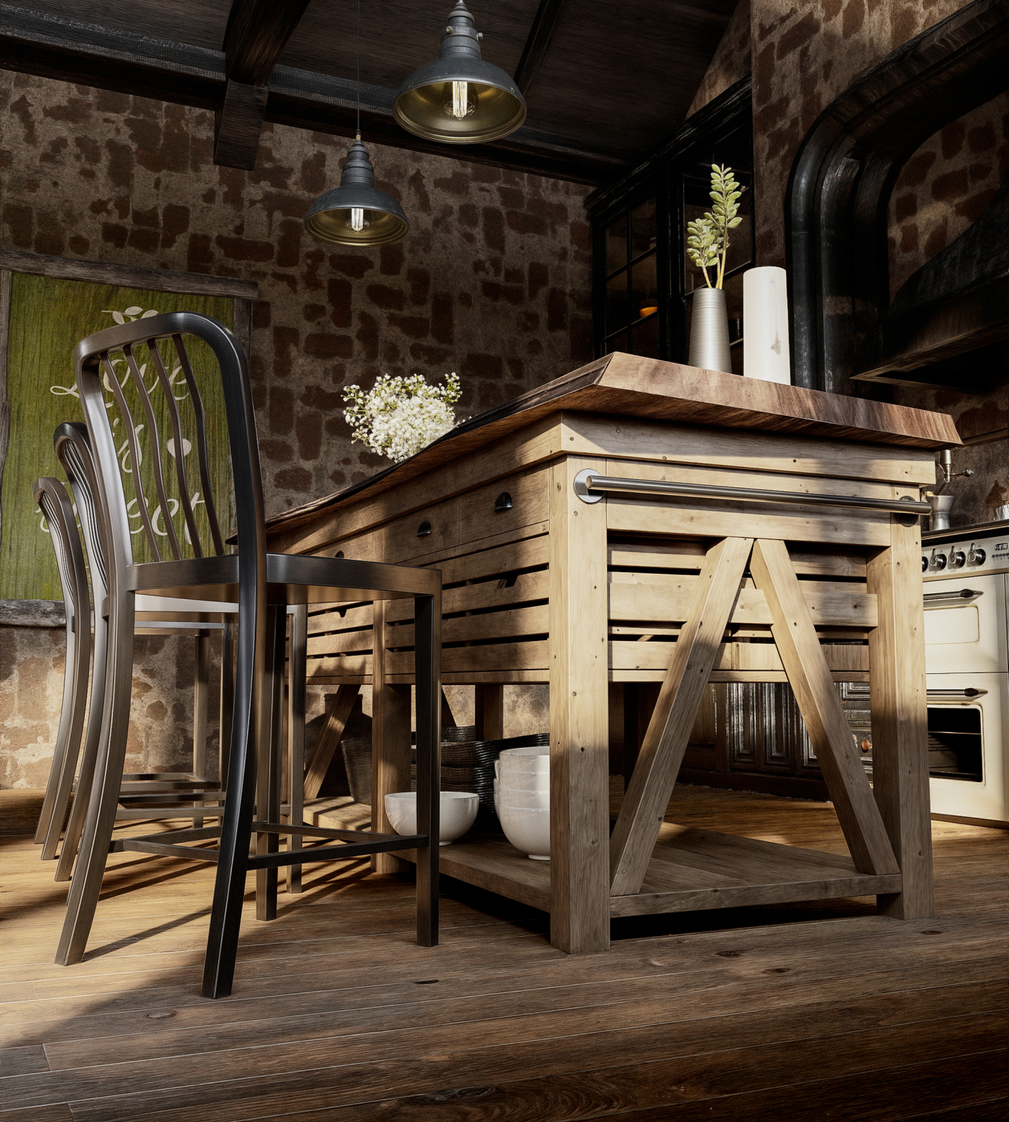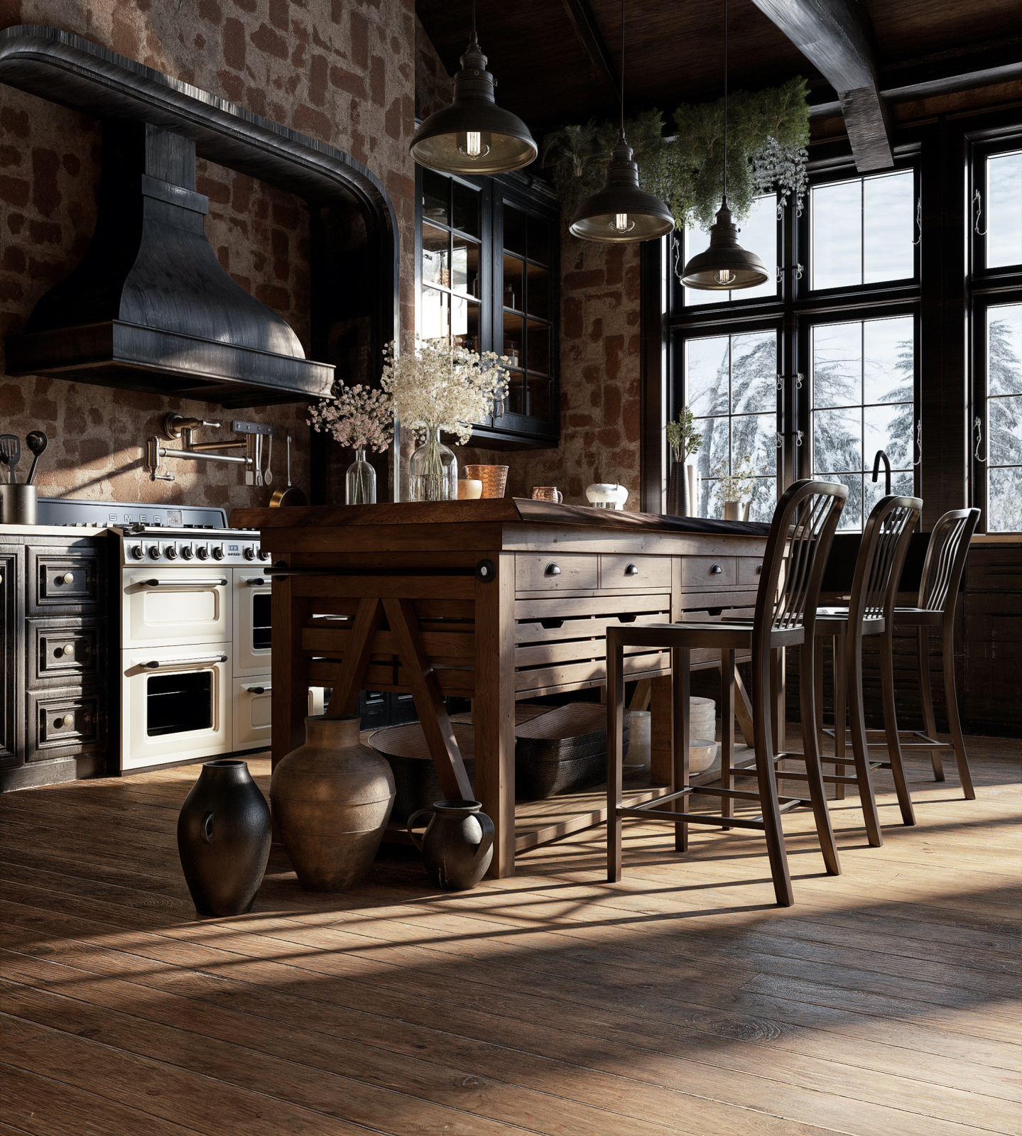 Warm rustic kitchen with exposed brick walls, dark wood cabinetry, a handcrafted wooden island, vintage lighting, and a cozy cinematic atmosphere