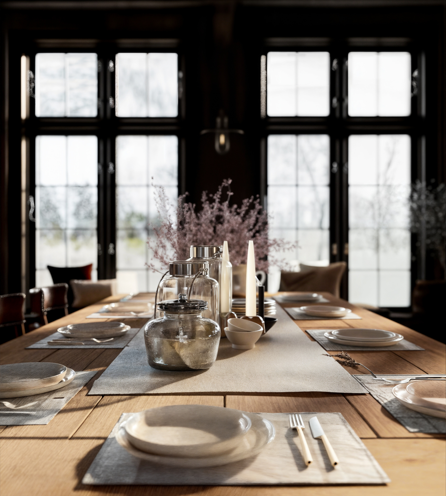 Warm rustic dining space with dark wood interiors, large framed windows, natural daylight, handcrafted wooden furniture, and a cozy cinematic atmosphere