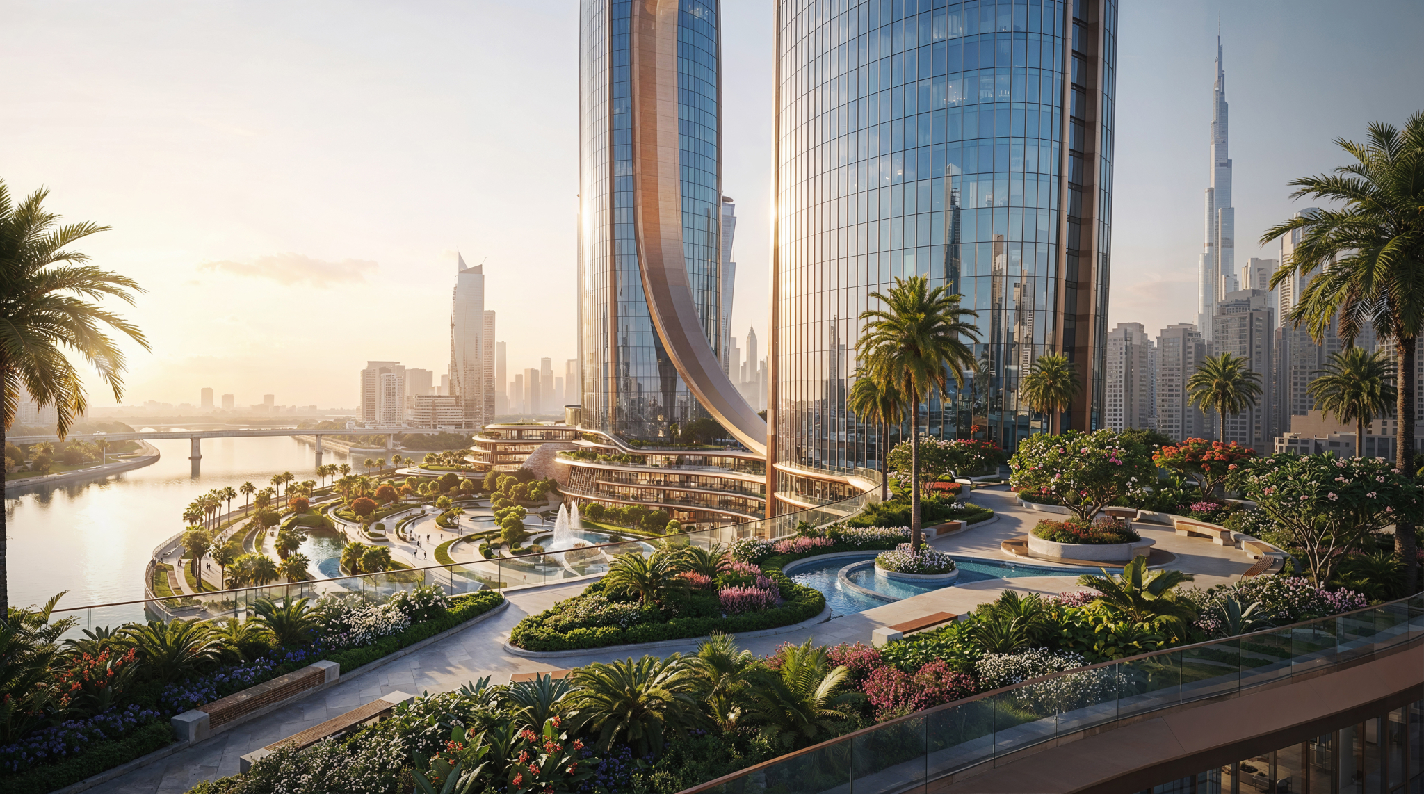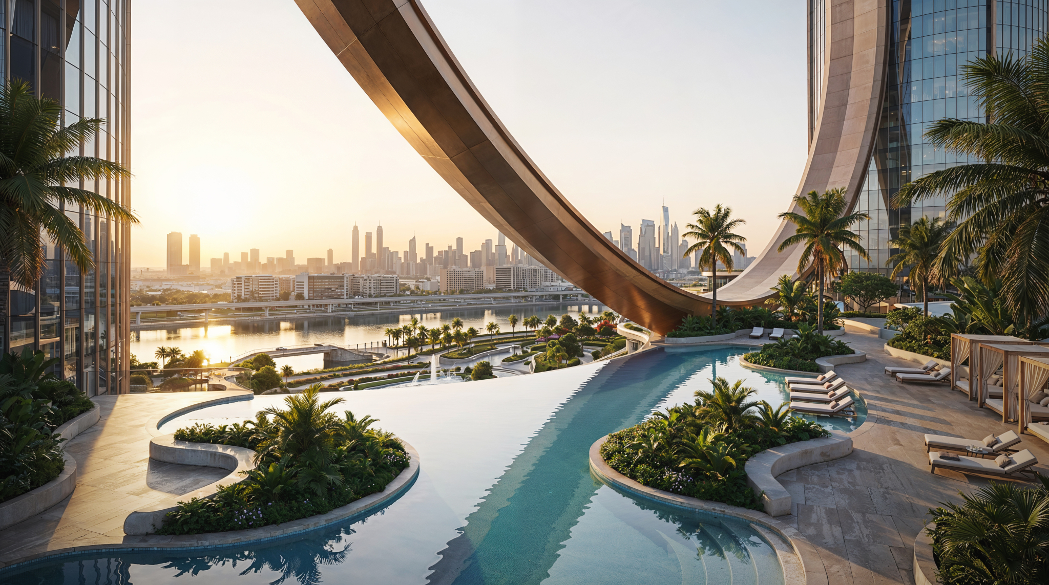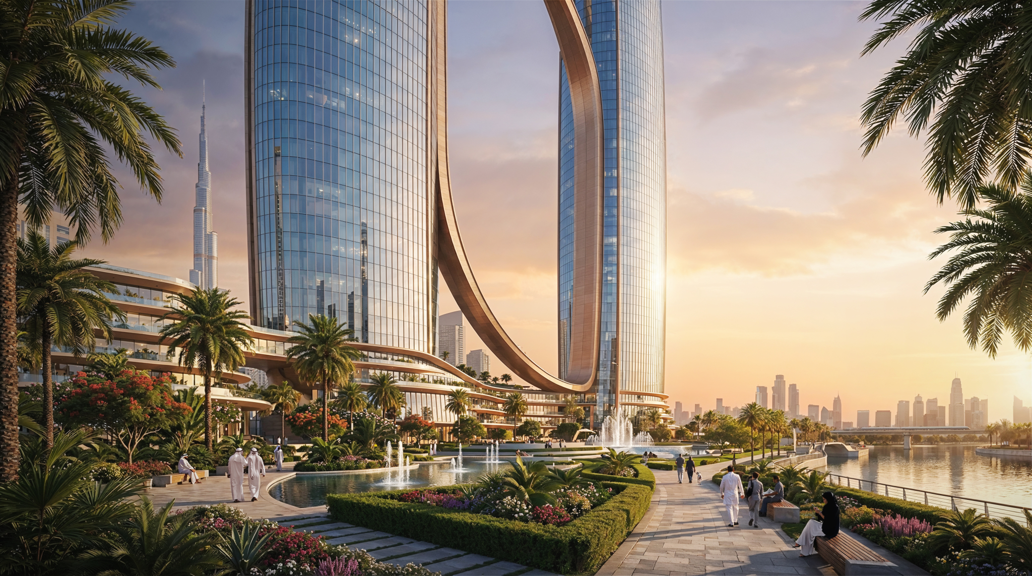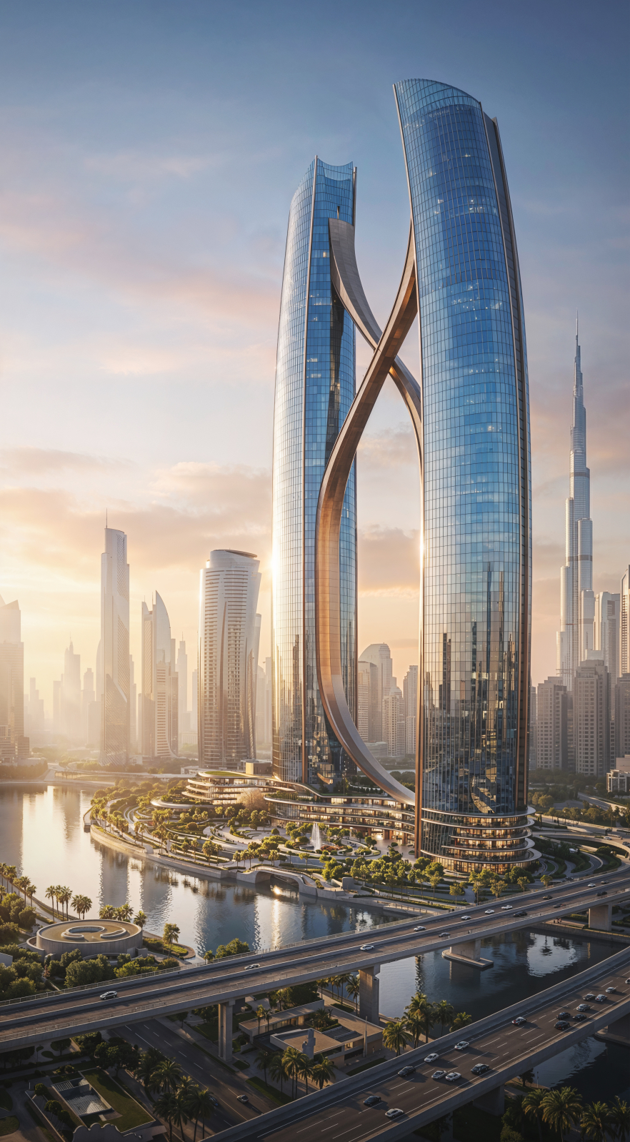 A futuristic waterfront landmark defined by twin glass towers and a dramatic sweeping arc that frames the skyline. Set in warm golden-hour light, this series explores a balance of bold verticality, refined materials, and lush podium landscapes with terraces, fountains, and curated greenery. A vision of contemporary urban luxury where architecture, public realm, and nature merge into one cinematic experience.