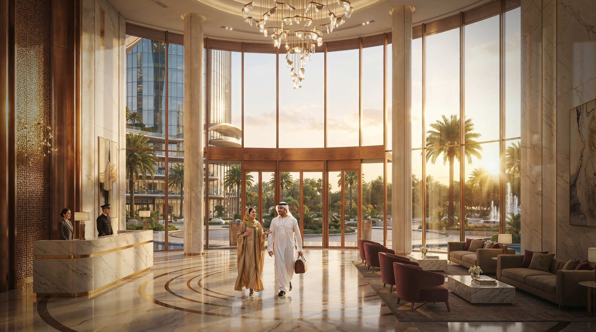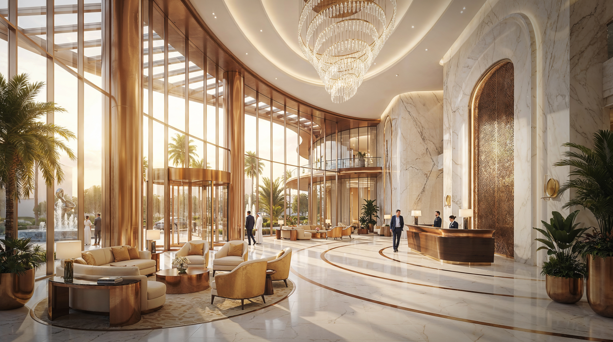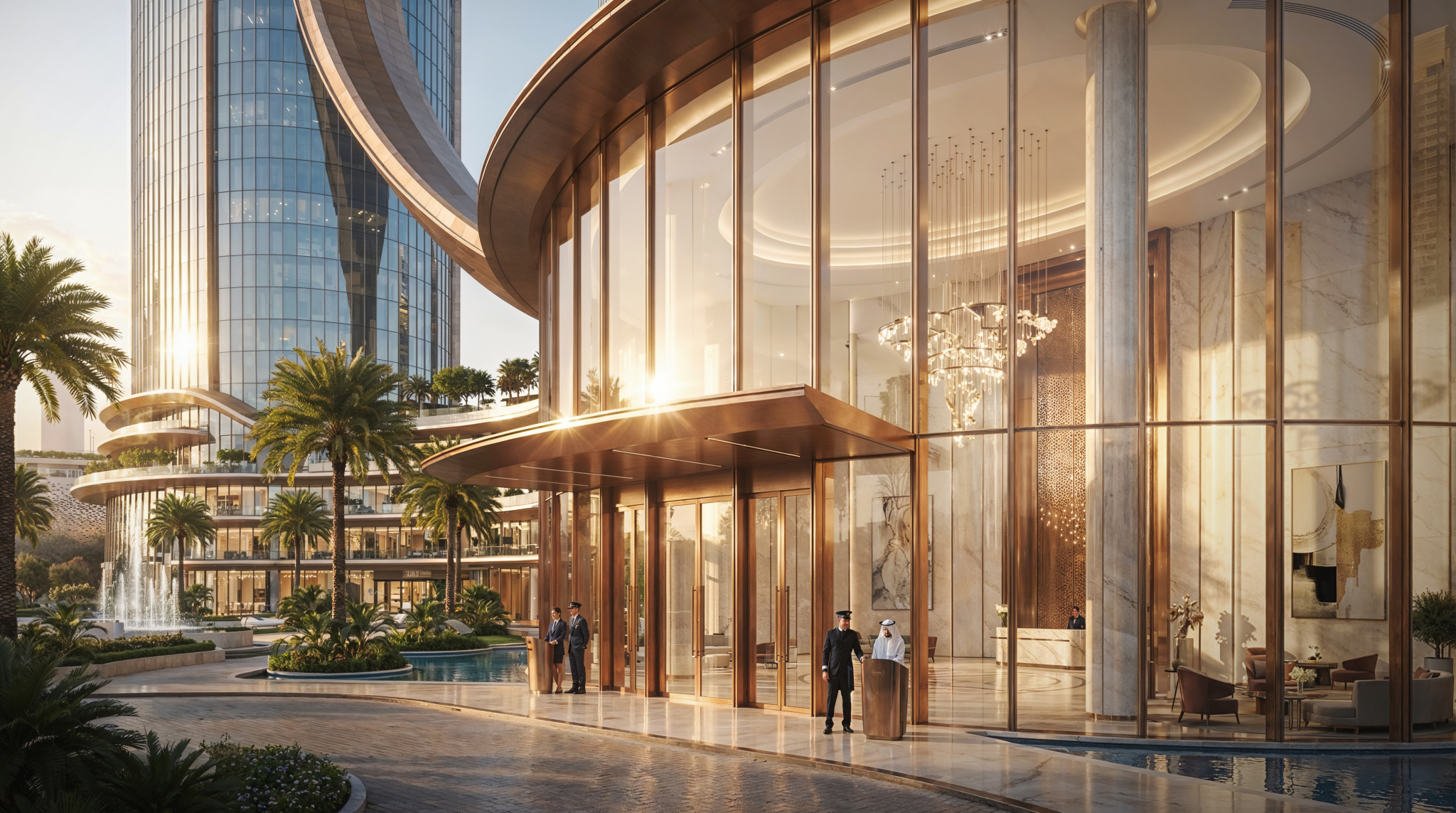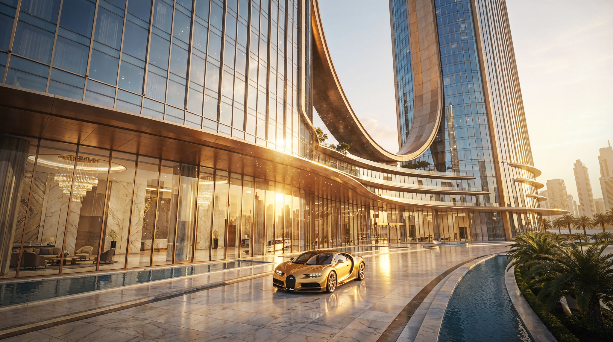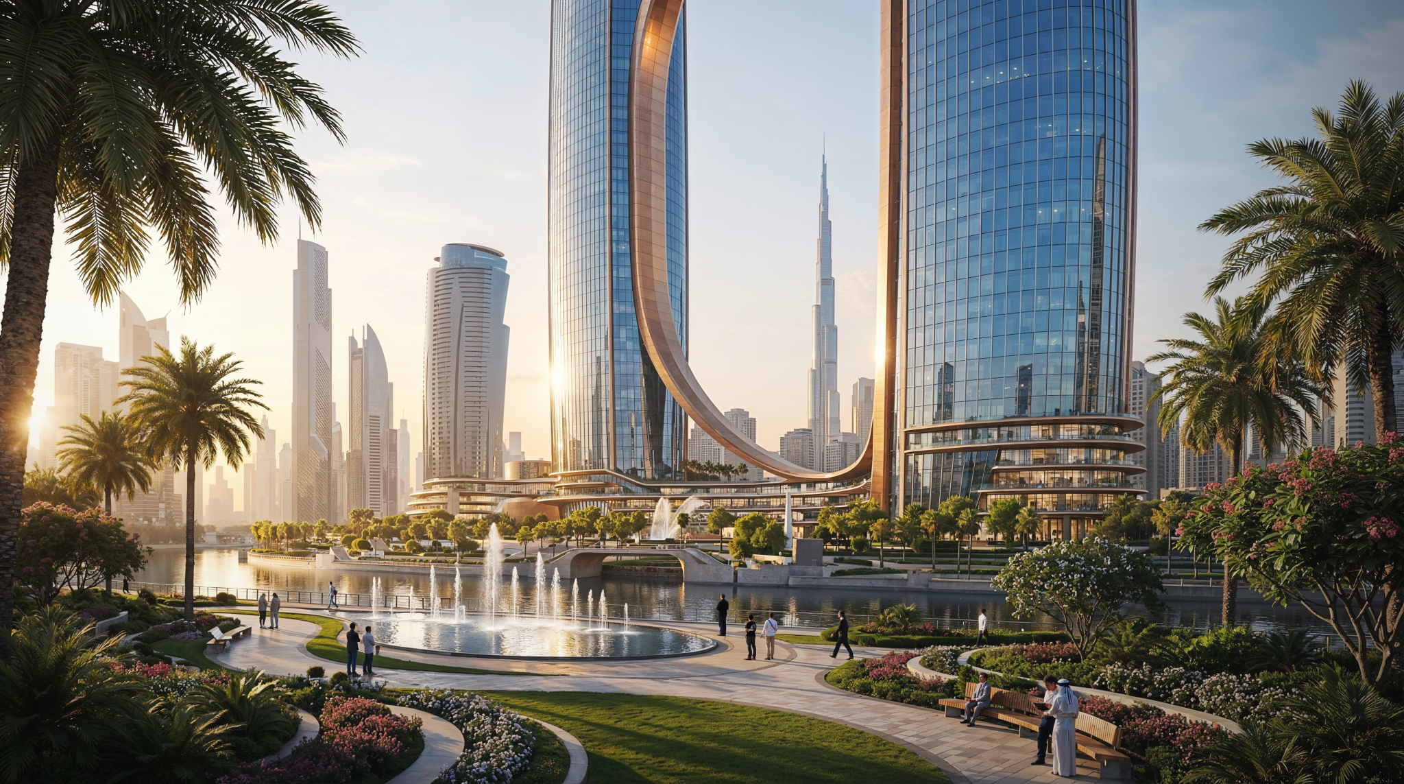 A futuristic waterfront landmark defined by twin glass towers and a dramatic sweeping arc that frames the skyline. Set in warm golden-hour light, this series explores a balance of bold verticality, refined materials, and lush podium landscapes with terraces, fountains, and curated greenery. A vision of contemporary urban luxury where architecture, public realm, and nature merge into one cinematic experience.