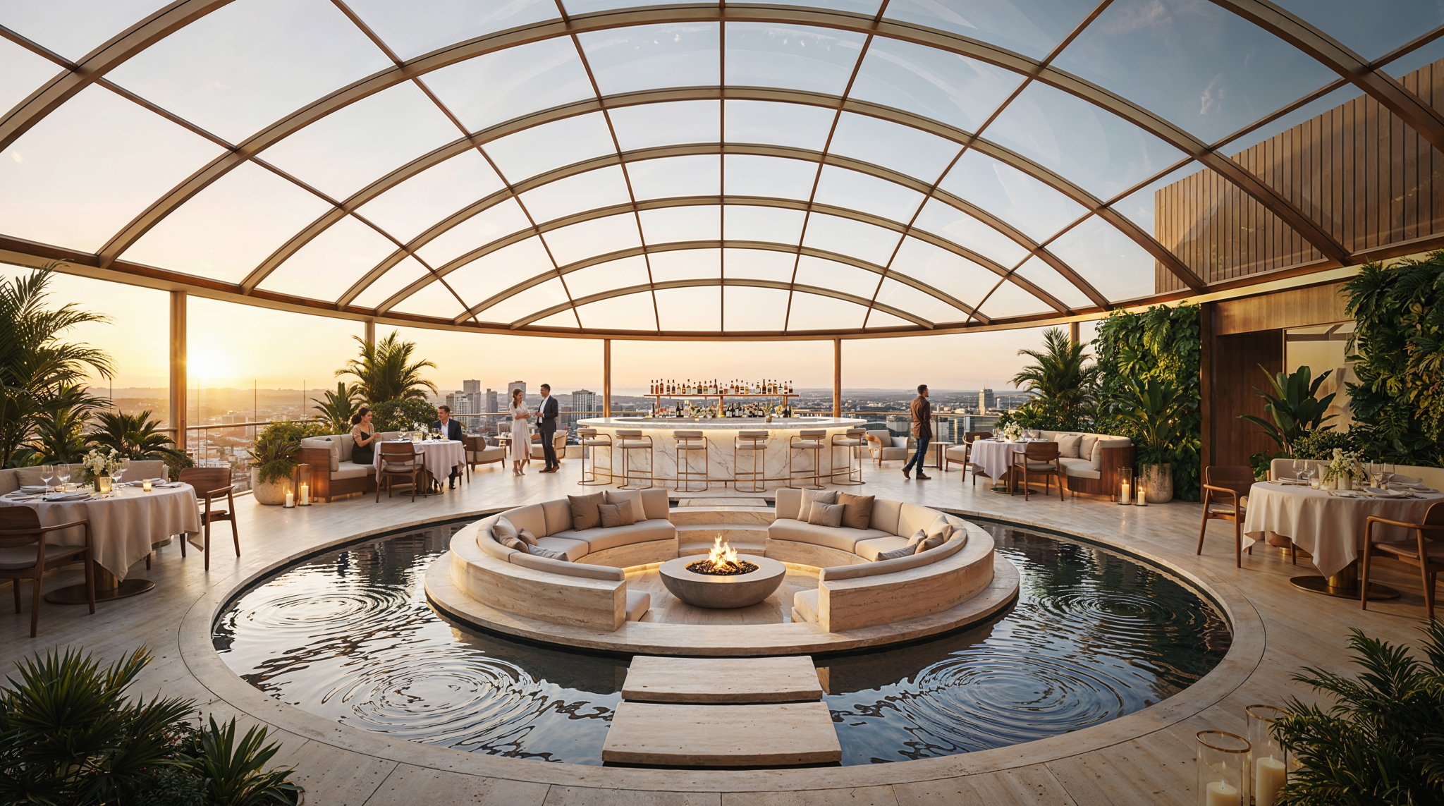 A set of high-end architectural visualizations for a modern mixed-use building, featuring a cinematic dusk street-corner hero shot, a clean front elevation, and an atmospheric rooftop lounge scene. Focused on p
