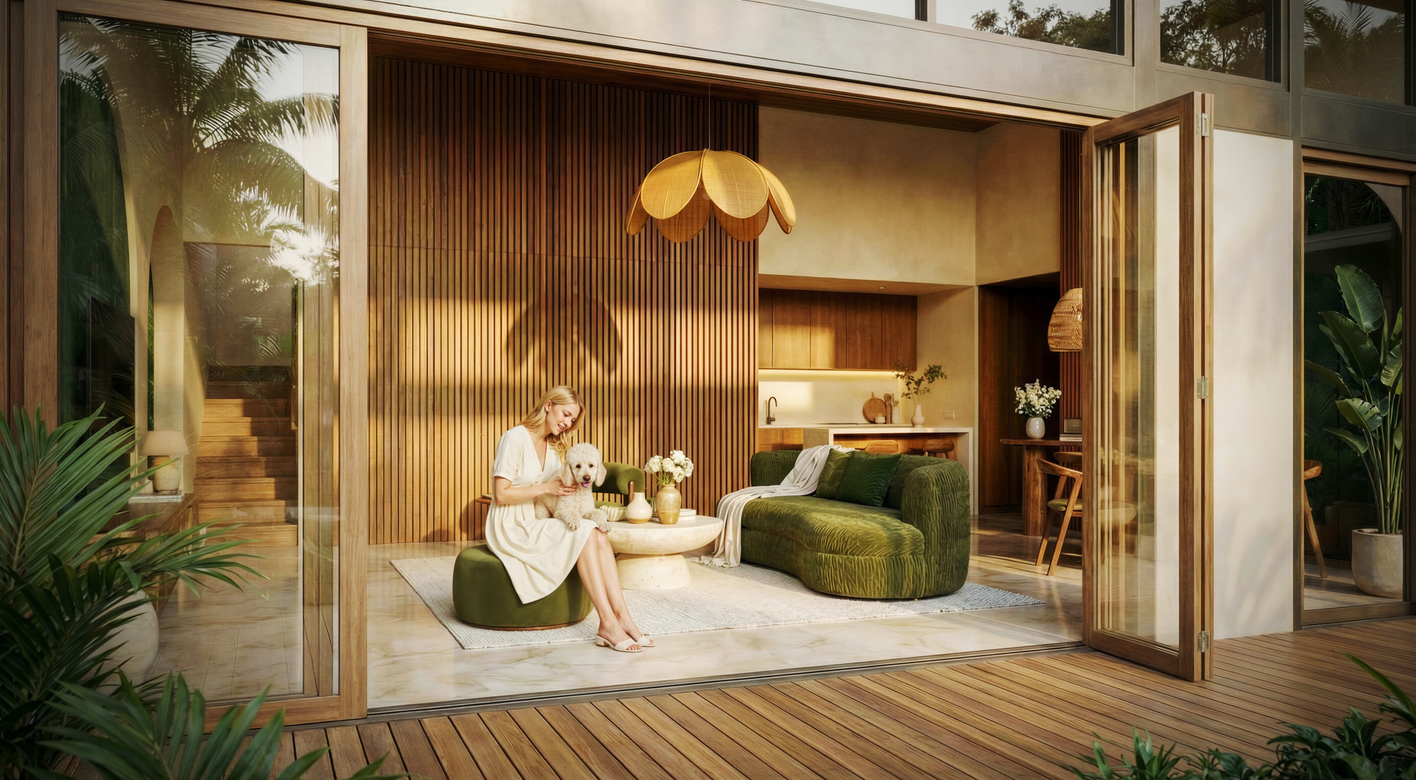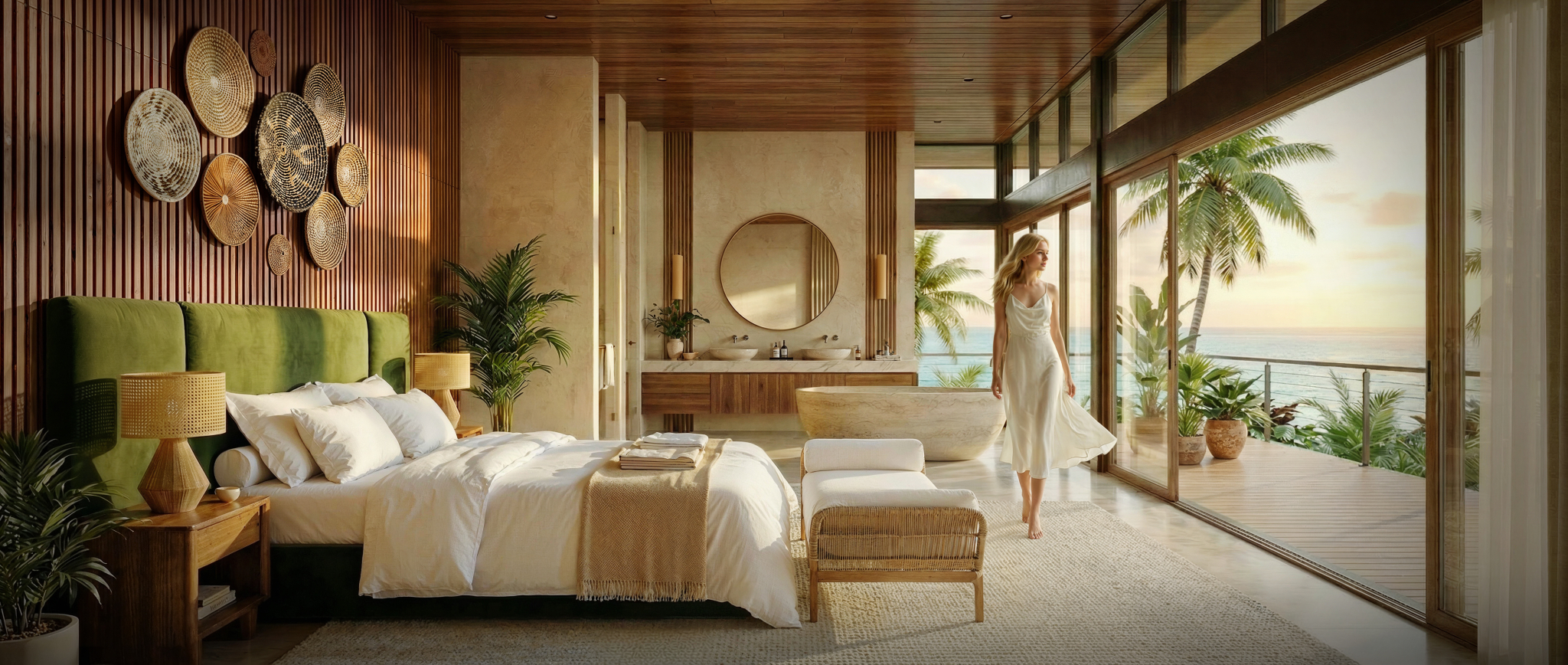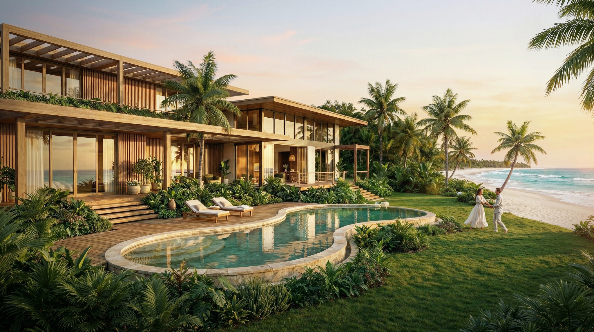 A tropical modern beachfront villa envisioned as a seamless indoor, outdoor retreat, warm timber architecture, lush landscaping, and soft natural materials crafted to feel calm, elevated, and livable.