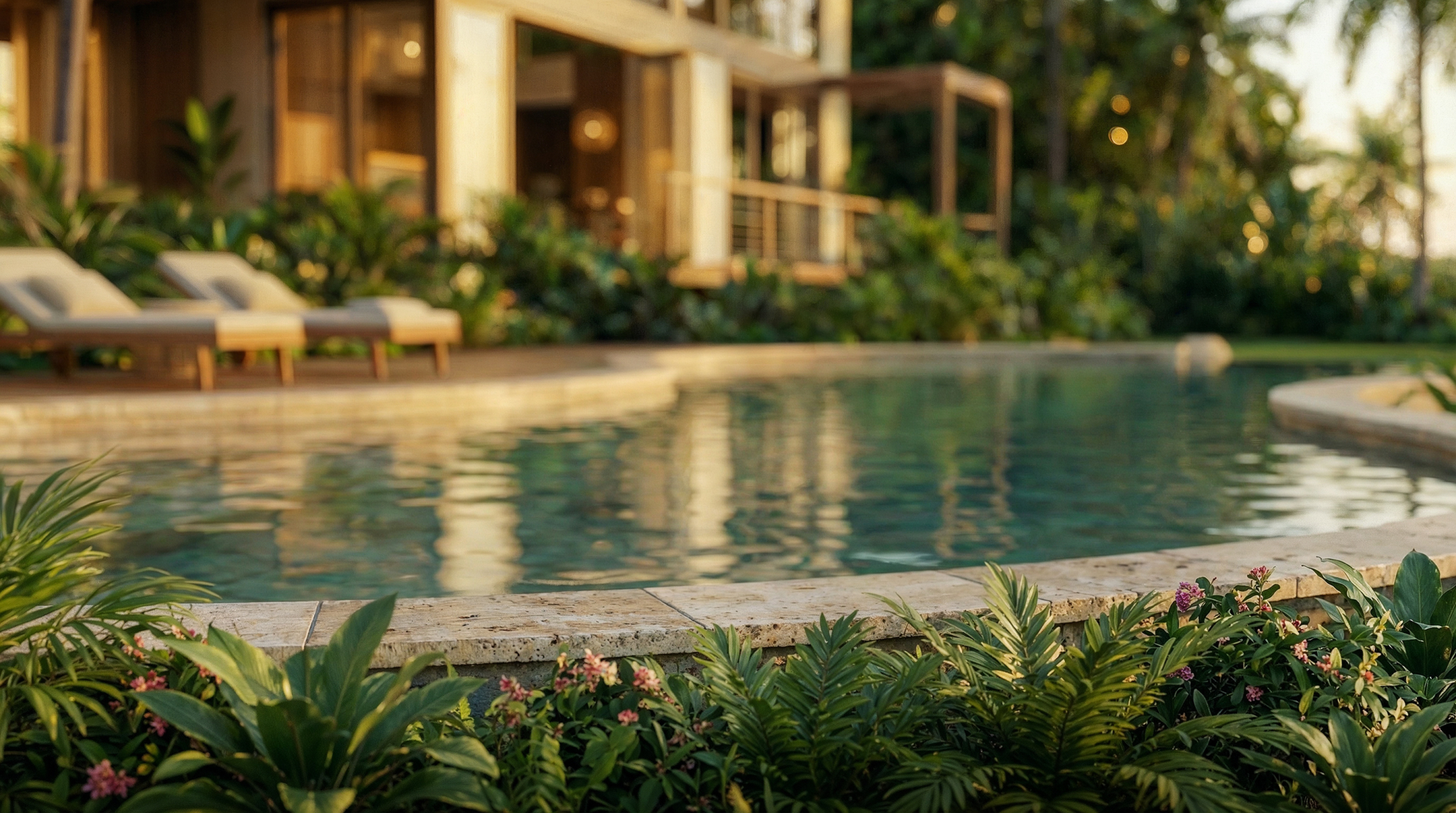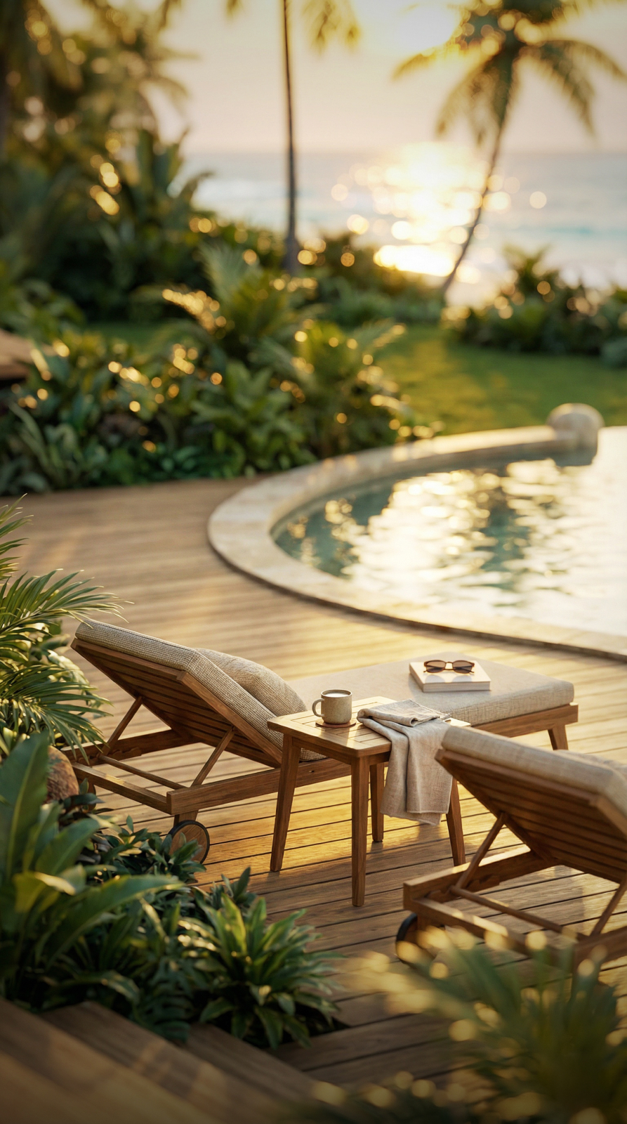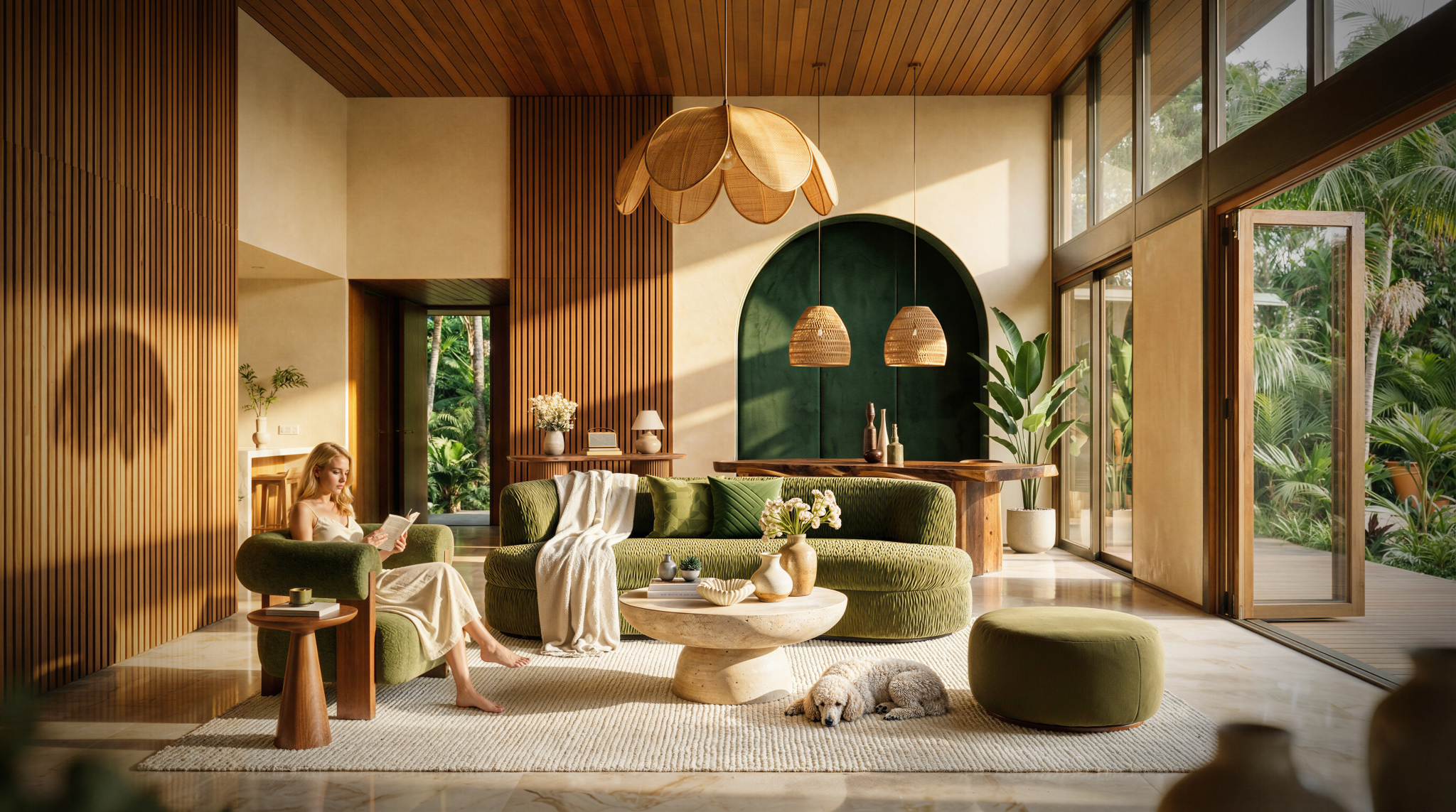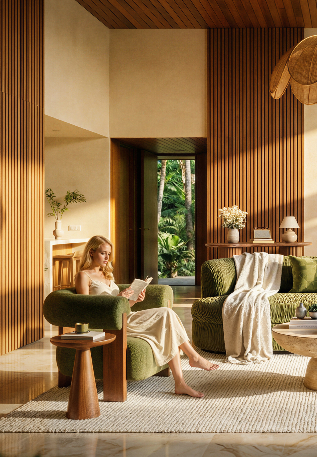 A tropical modern beachfront villa envisioned as a seamless indoor, outdoor retreat, warm timber architecture, lush landscaping, and soft natural materials crafted to feel calm, elevated, and livable.