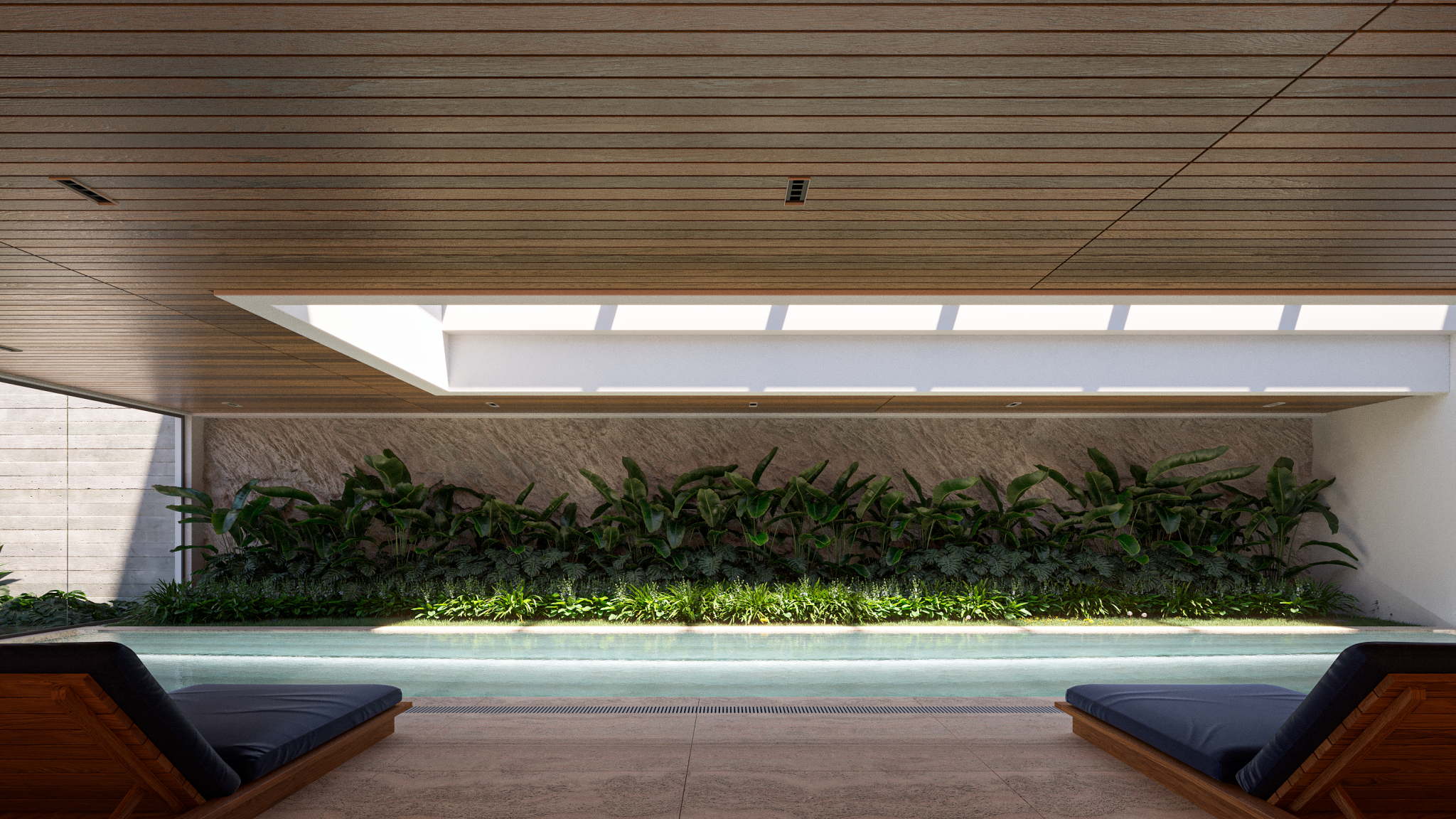 This project explores the relationship between natural light, architectural design, and materiality within a contemporary wellness space. The zenithal daylight enhances the textures of wood, concrete, and water, creating soft contrasts and a calm, immersive atmosphere. Clean lines and a restrained composition emphasize spatial clarity, while the integration of natural materials and vegetation reinforces a sense of comfort, balance, and connection to the environment.