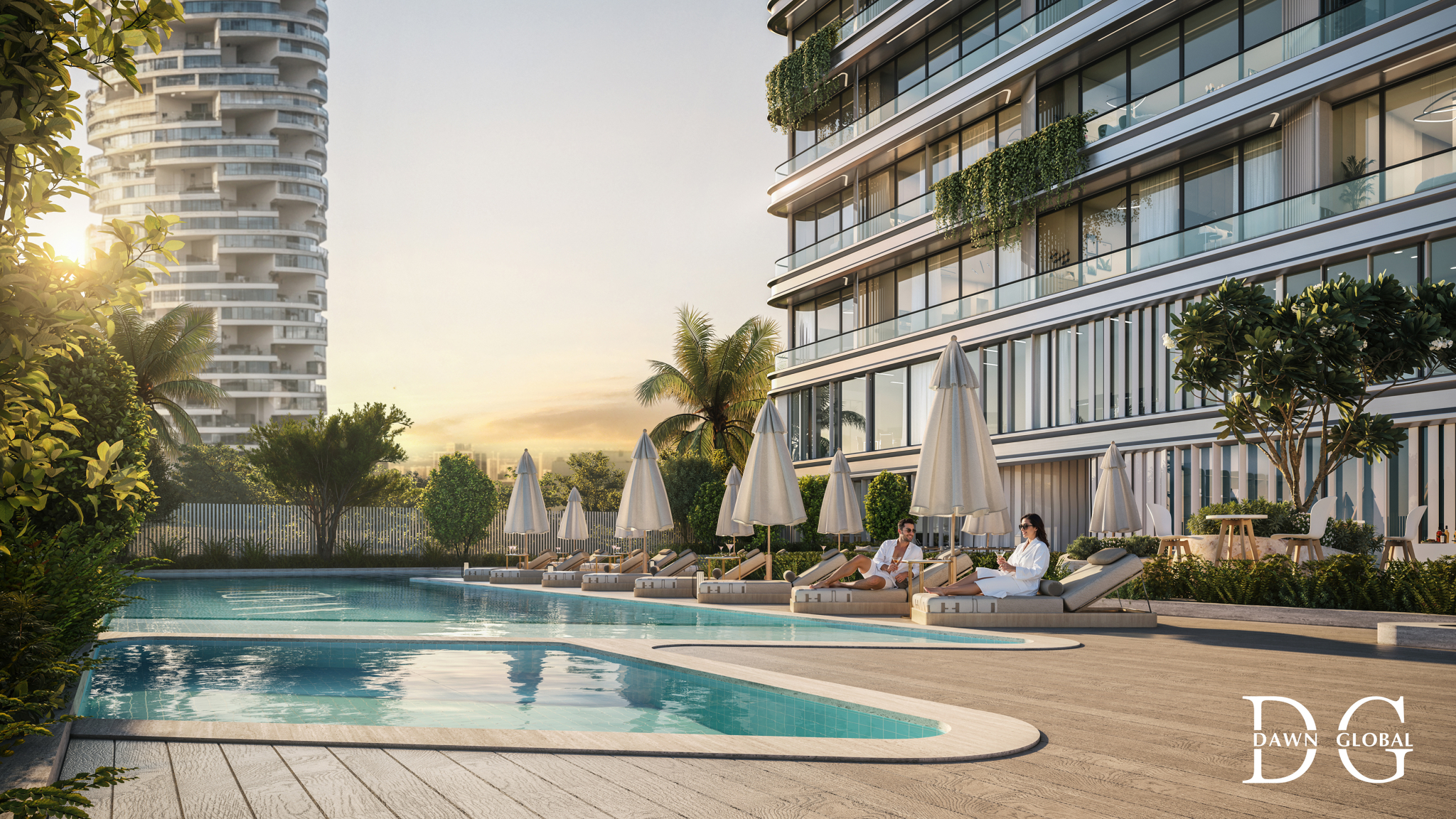 Azizi Milan in Dubai Land is visualized by Dawn Global, capturing refined contemporary architecture, luminous spaces, and a lifestyle of balance — where community, clarity, and calm converge.