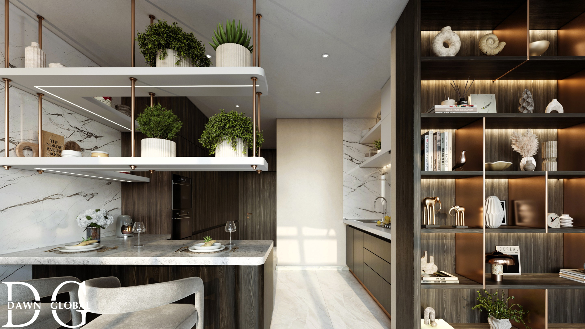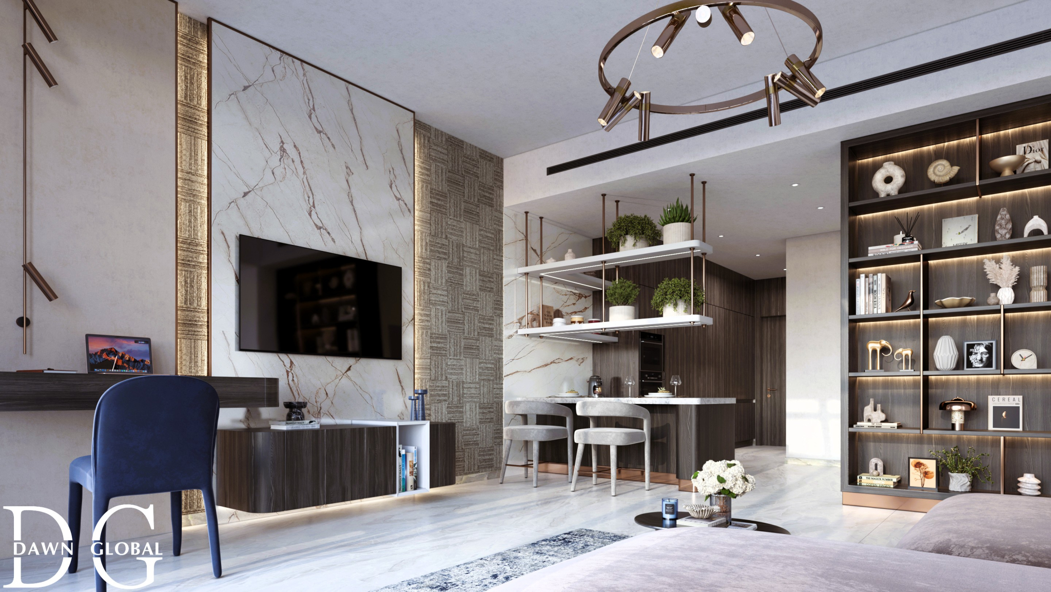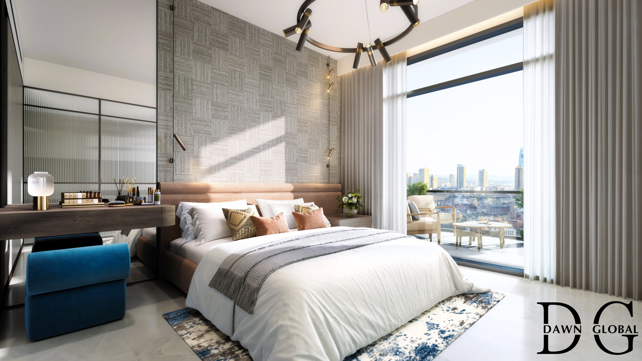 At Dawn Global, our role was to translate this architectural intent into atmosphere. Through carefully crafted CGI stills and cinematic walkthroughs, we captured the interplay of light across façades, the rhythm of balconies, and the warmth of interior spaces shaped for everyday comfort.