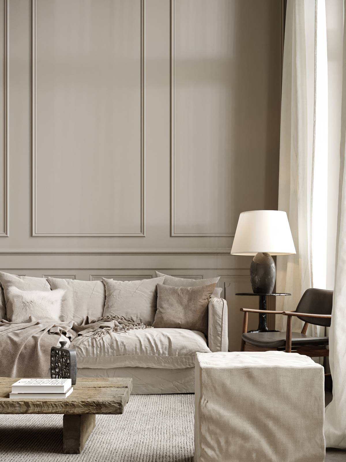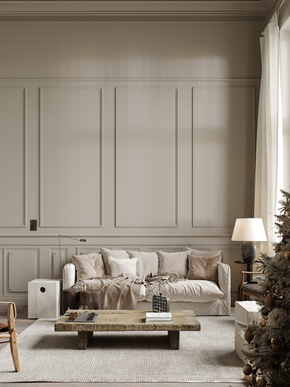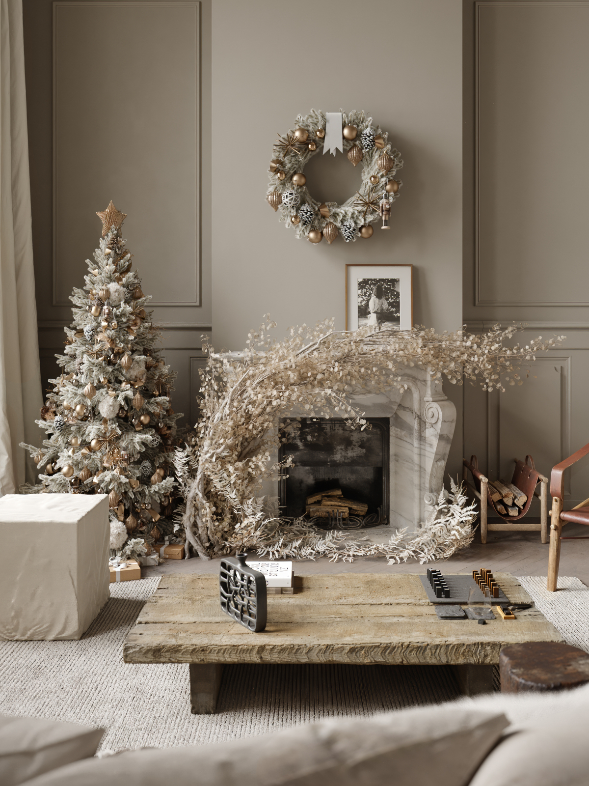 A cozy, elegant Christmas interior styled in neutral tones. The scene features a decorated Christmas tree with soft white and gold ornaments, a classic fireplace adorned with a natural wreath and dried foliage,