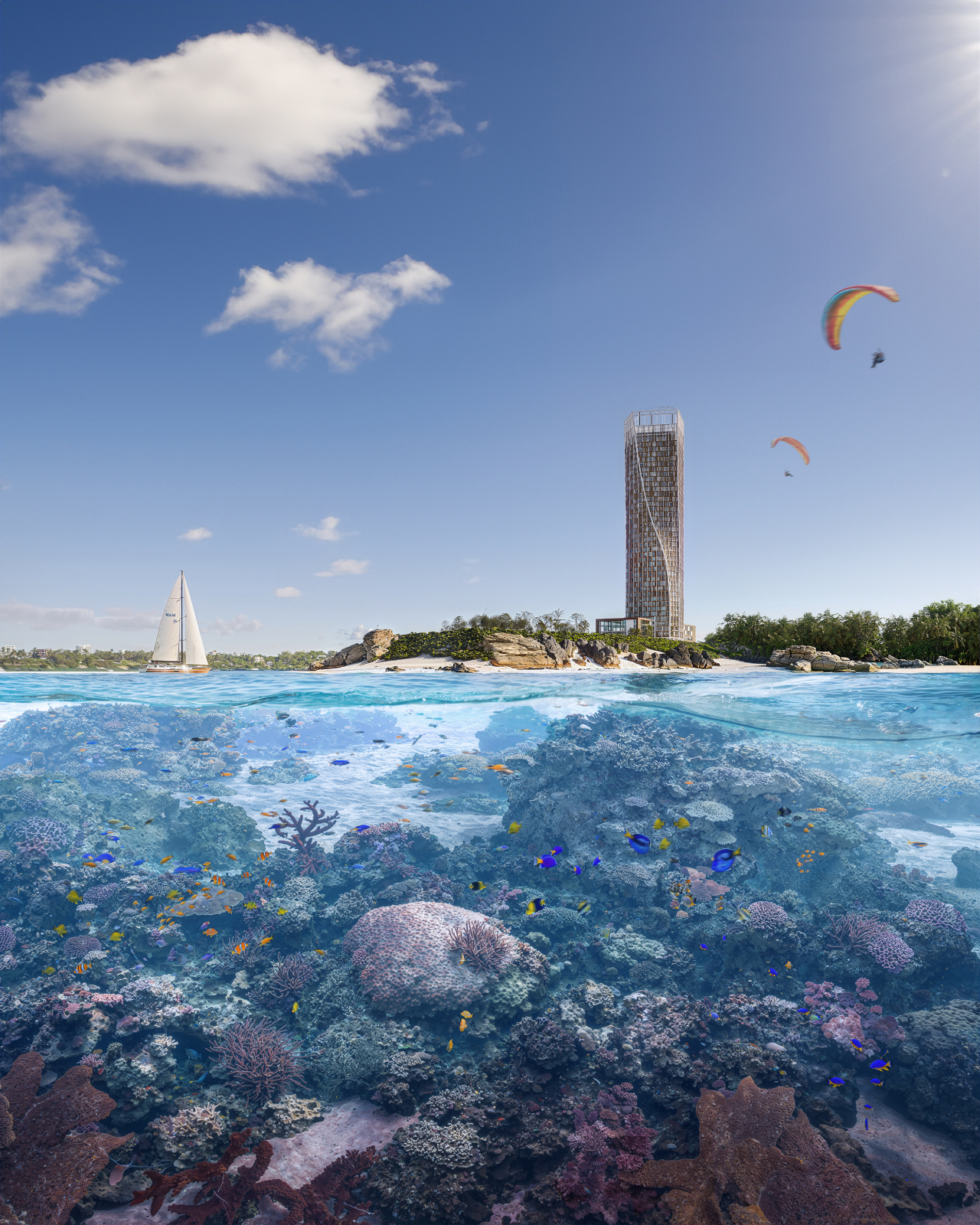 Project fully in 3D: villages, housing, corals. Terrain modeled from displacement map, quad remeshed, and adjusted. Details: diverse corals, marine fish, and photogrammetry rocks. Tools: 3Ds Max, Corona, Photos
