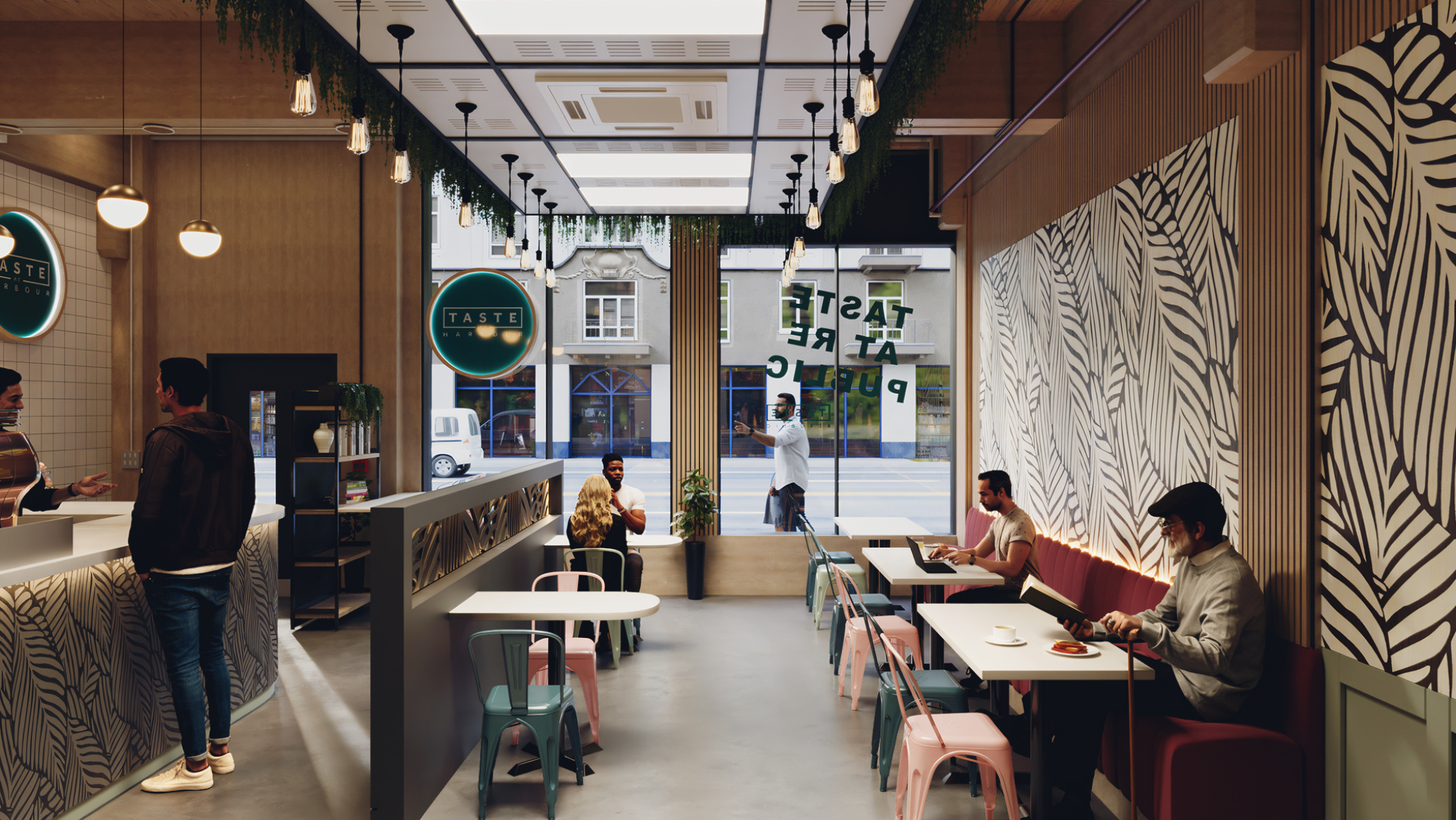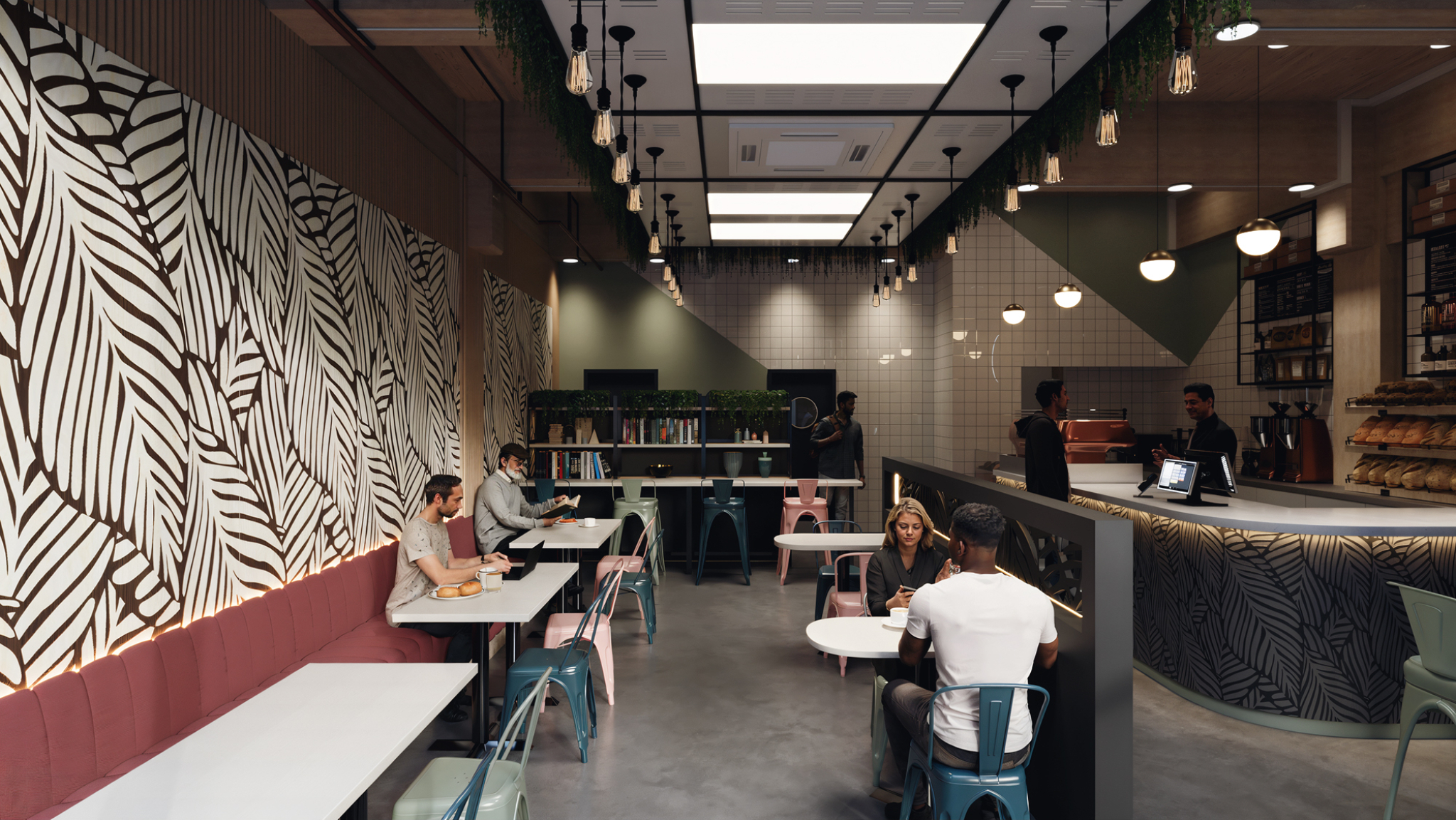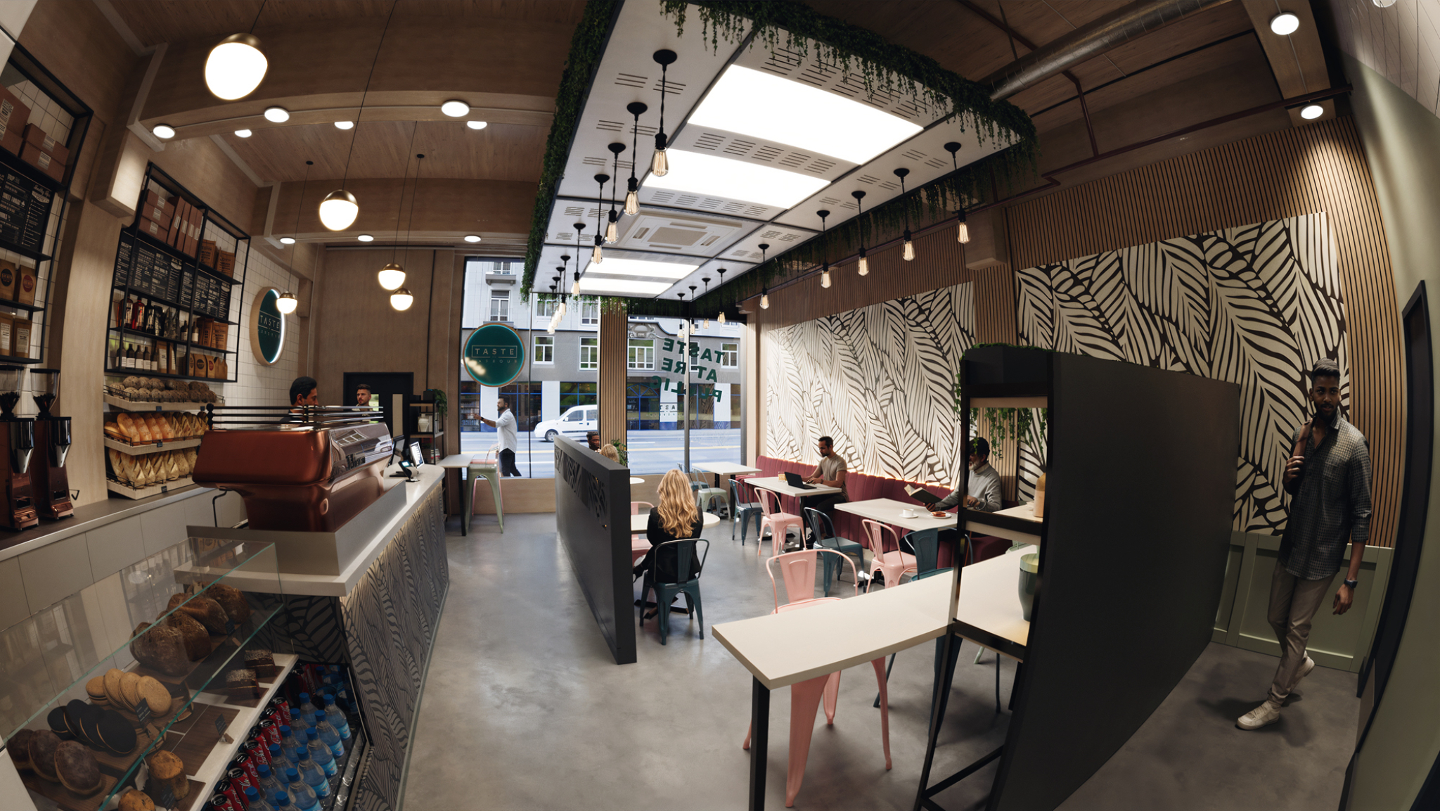 Create a set of visuals for a design of a café for a design and build company called Vis-com