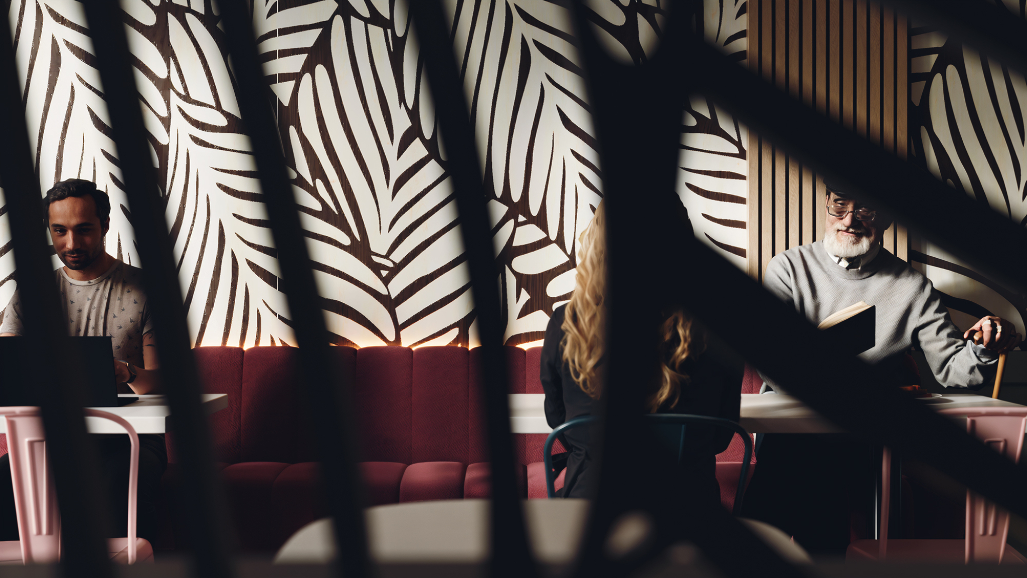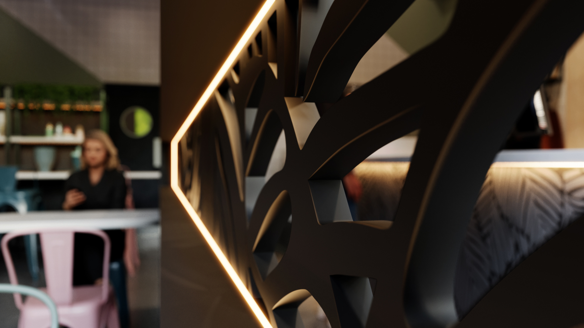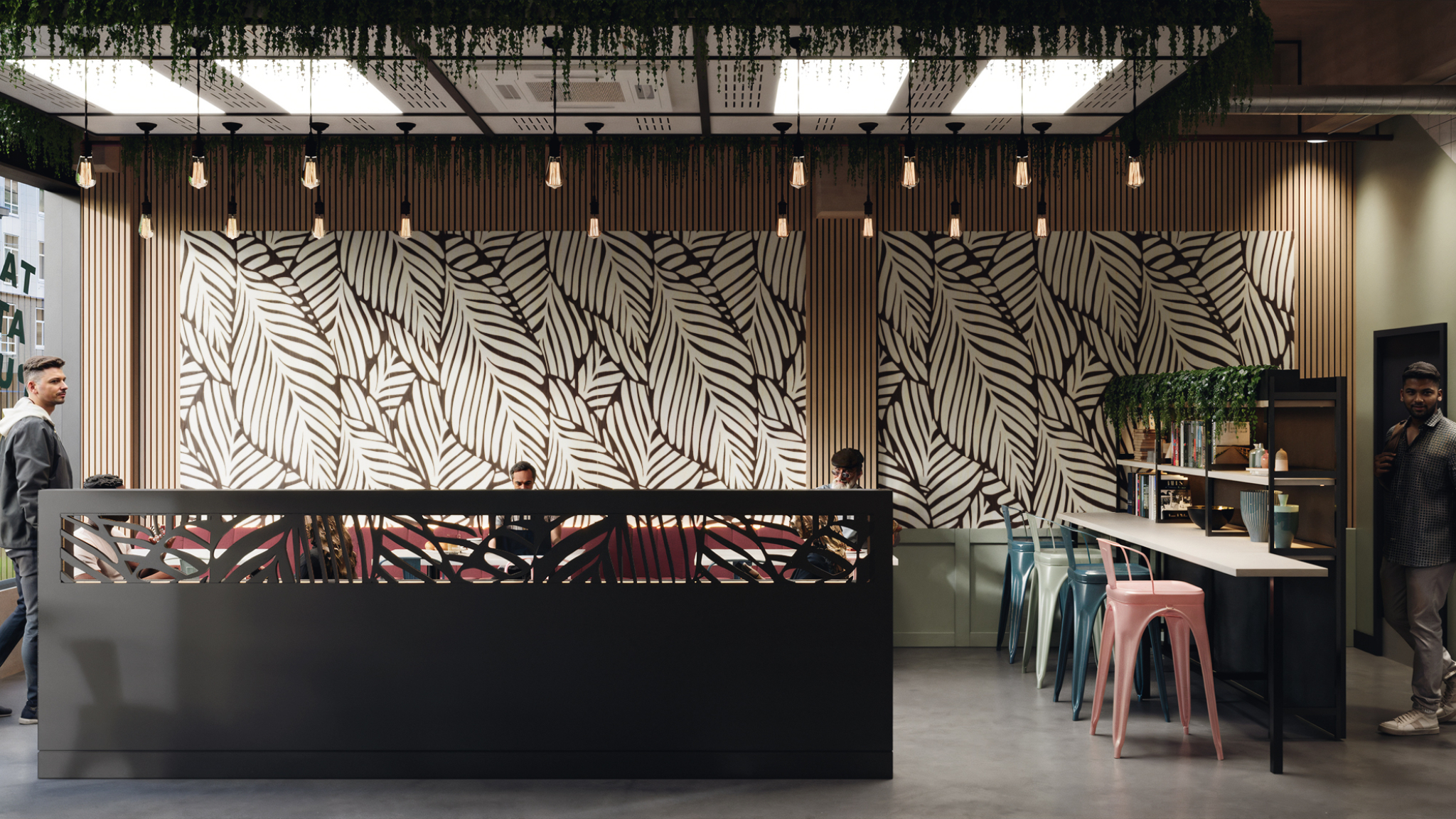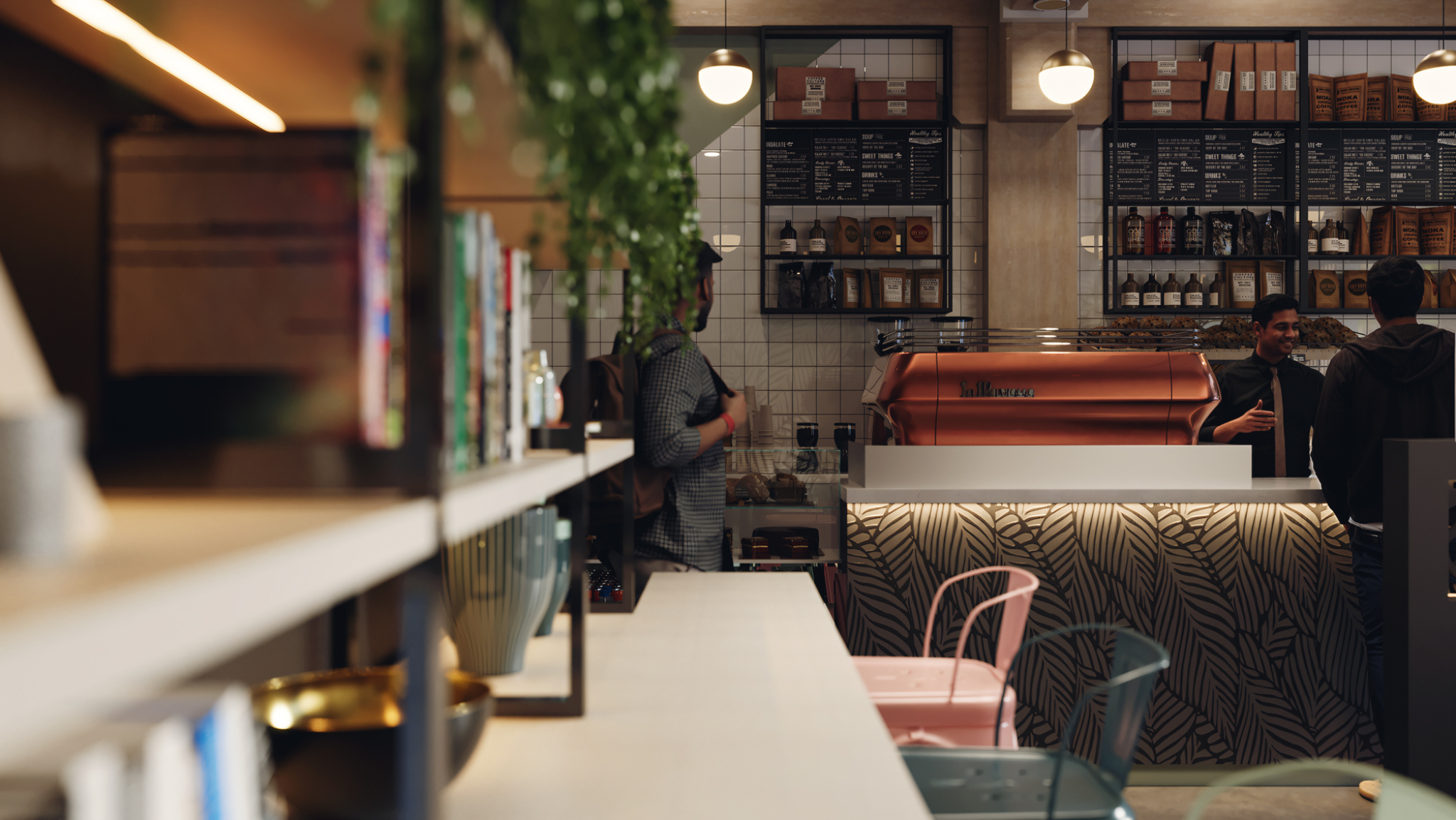 Create a set of visuals for a design of a café for a design and build company called Vis-com