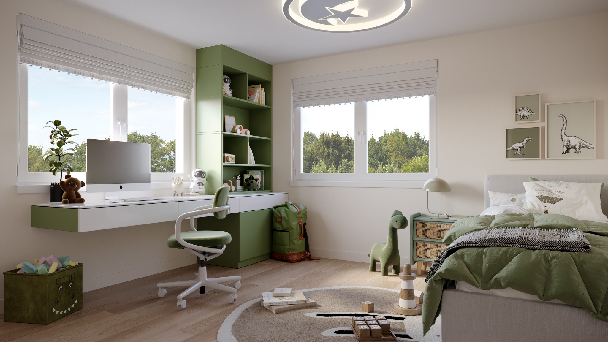 Every detail, from the gentle textures of the bedding to the subtle contrast of green accents, was carefully tuned to balance freshness and calm. The composition celebrates openness, light flow, and the harmony between play and focus.