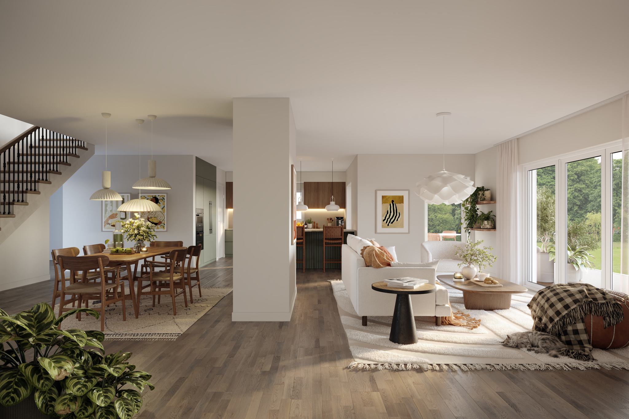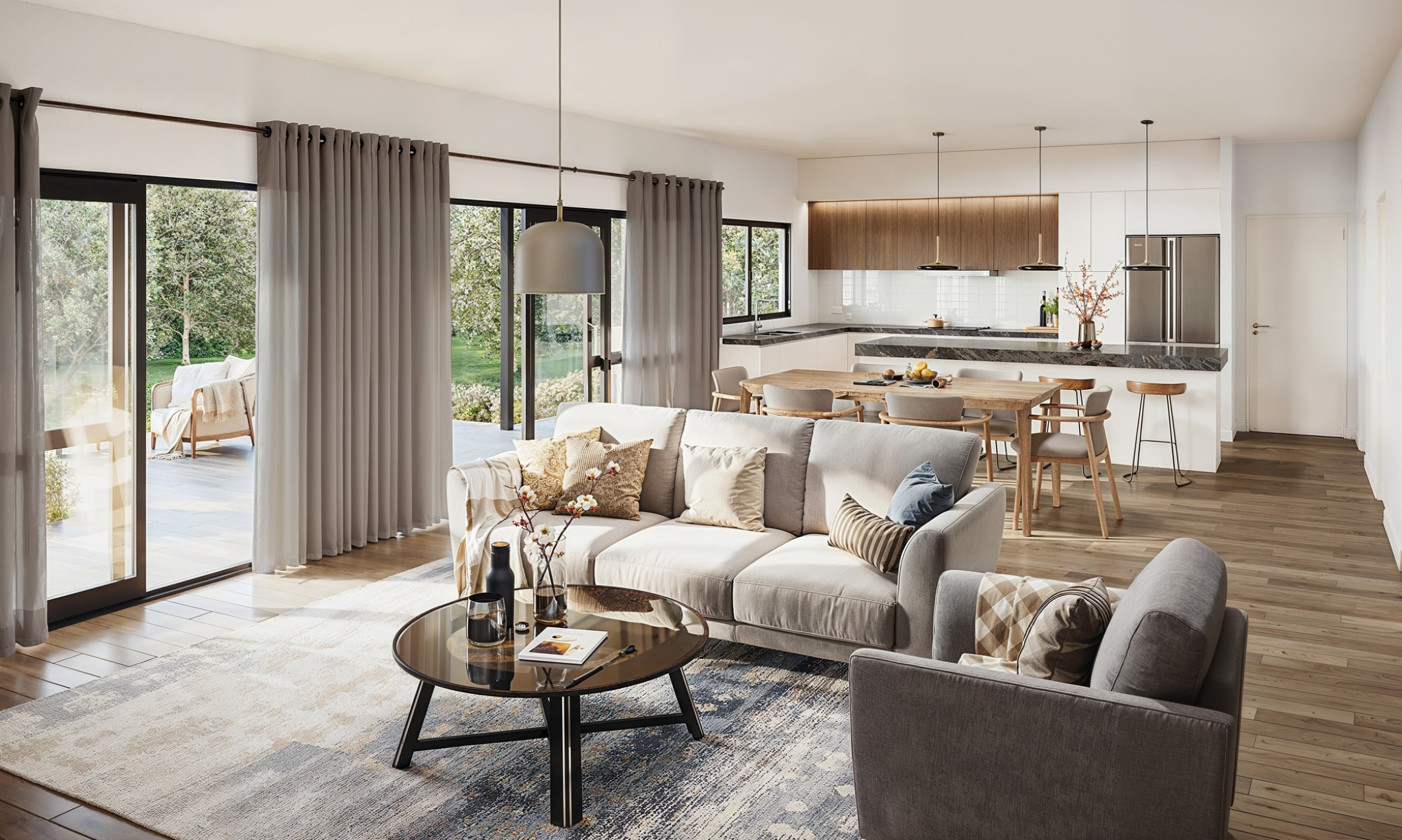 Sunlight softens every corner, highlighting wood, fabric, and greenery to create a warm, inviting flow across living, dining, and kitchen spaces. Each detail feels intentional, forming a mood of calmness and timeless charm.