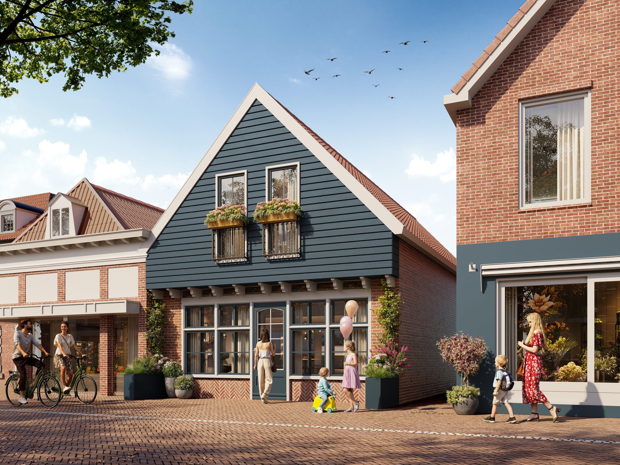 Soft sunlight washes over brick walls and gentle rooflines, giving this small neighborhood a welcoming, everyday charm. The street feels alive yet calm, a place where families can instantly imagine themselves living.