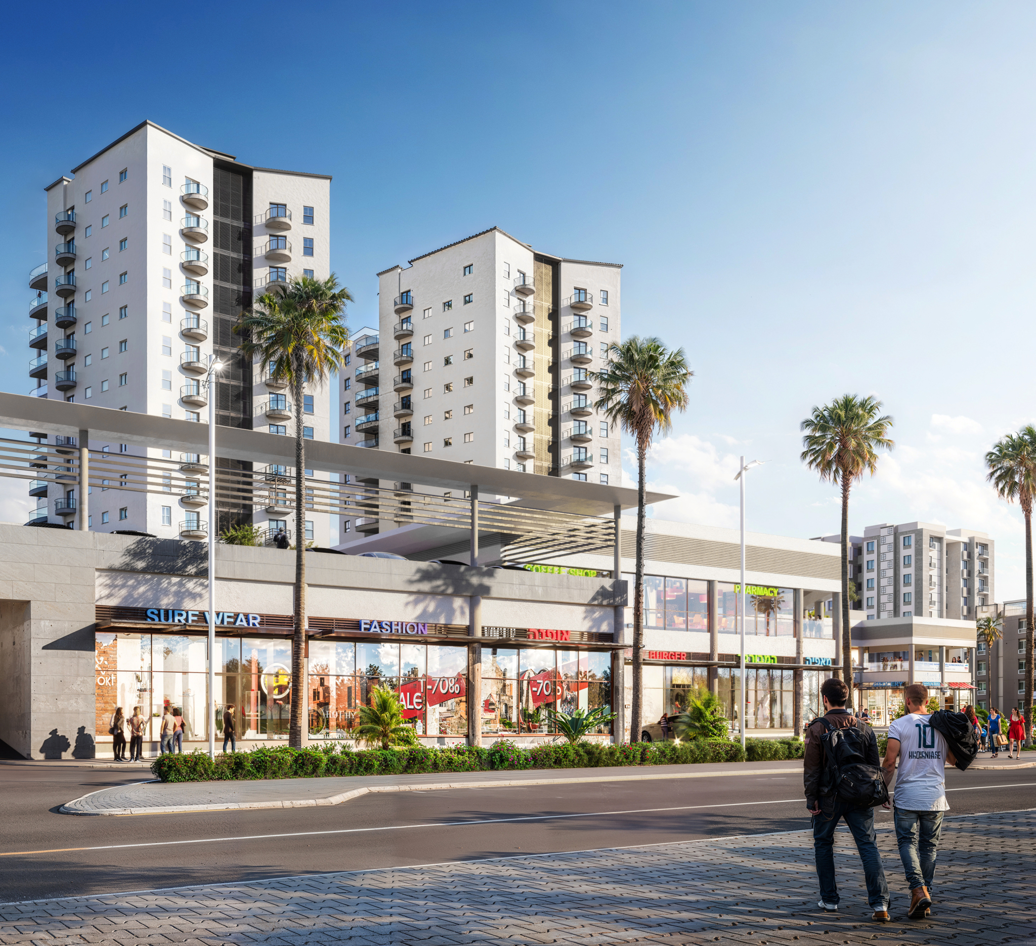 Framed by palm trees and open skies, this mixed-use complex blends residential comfort with the pulse of city life. Glass facades mirror the movement below, people, shops, and streets alive with motion, while light defines the structure’s clean geometry and warmth.