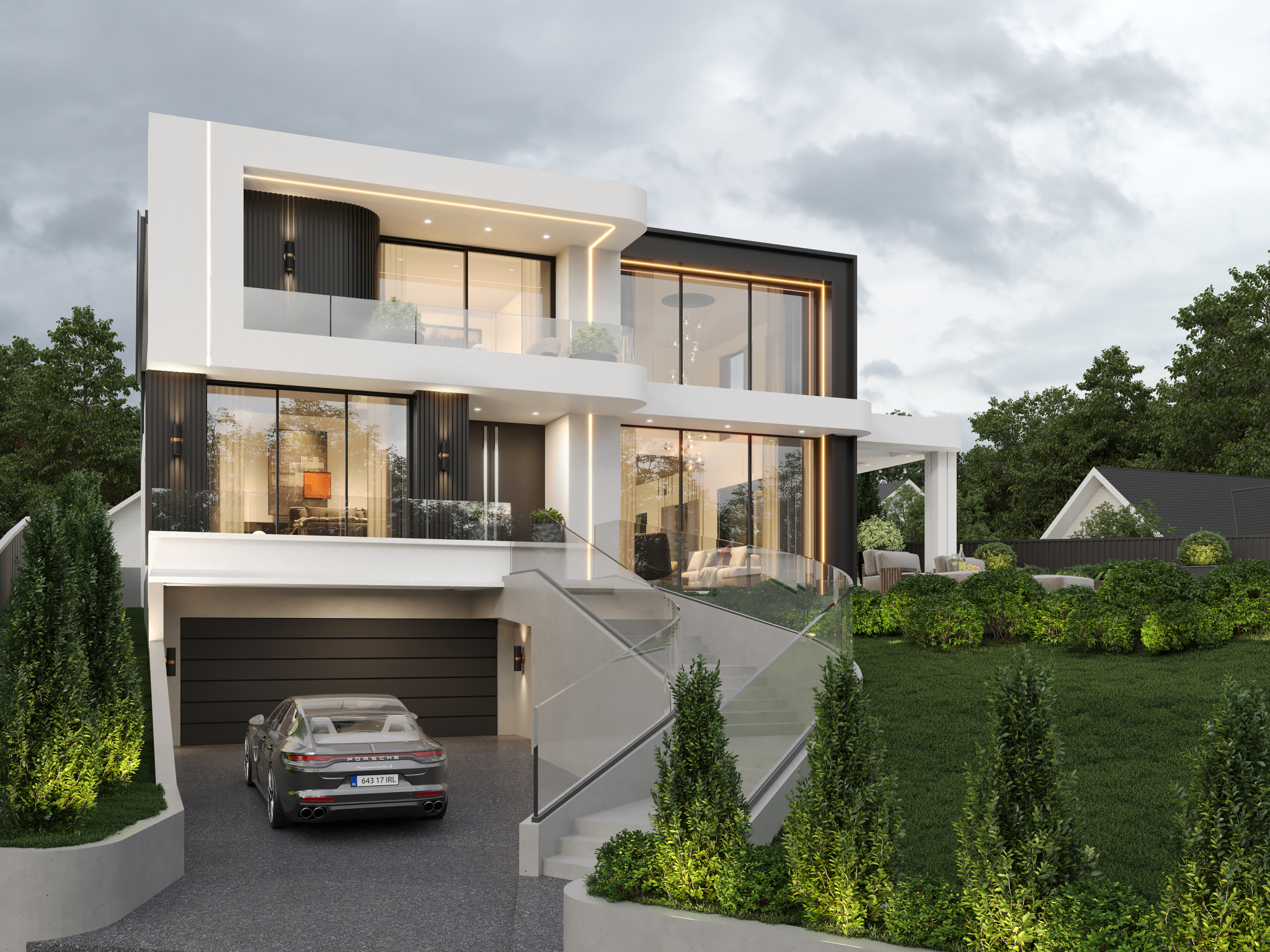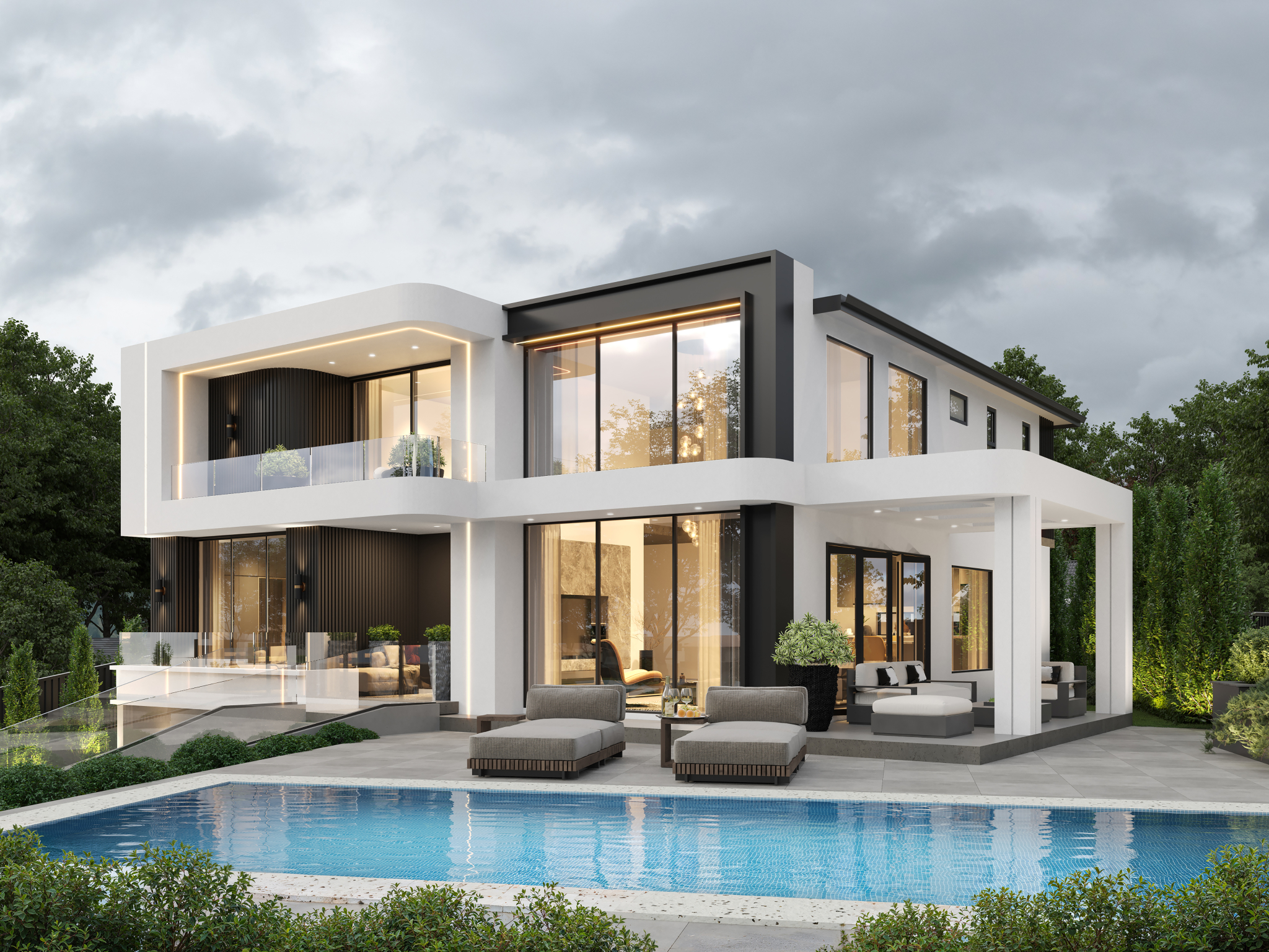 Clean white volumes paired with bold black accents create a striking contrast that opens panoramic views and fills the home with natural light. Soft balcony curves bring elegance to the strong geometry, while the infinity-edge pool and tiered landscaping extend the architecture into a resort-like outdoor retreat. The scene was developed in 3ds Max for accurate architectural detailing, rendered with Corona Renderer to achieve soft, natural lighting.