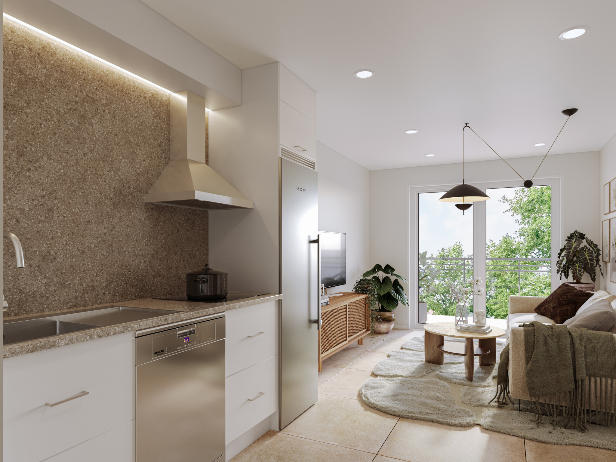 A warm minimalist interior where texture, tone, and daylight work together to create gentle harmony. The open kitchen flows into the living area, forming a cozy, functional space that feels both elegant and inviting.