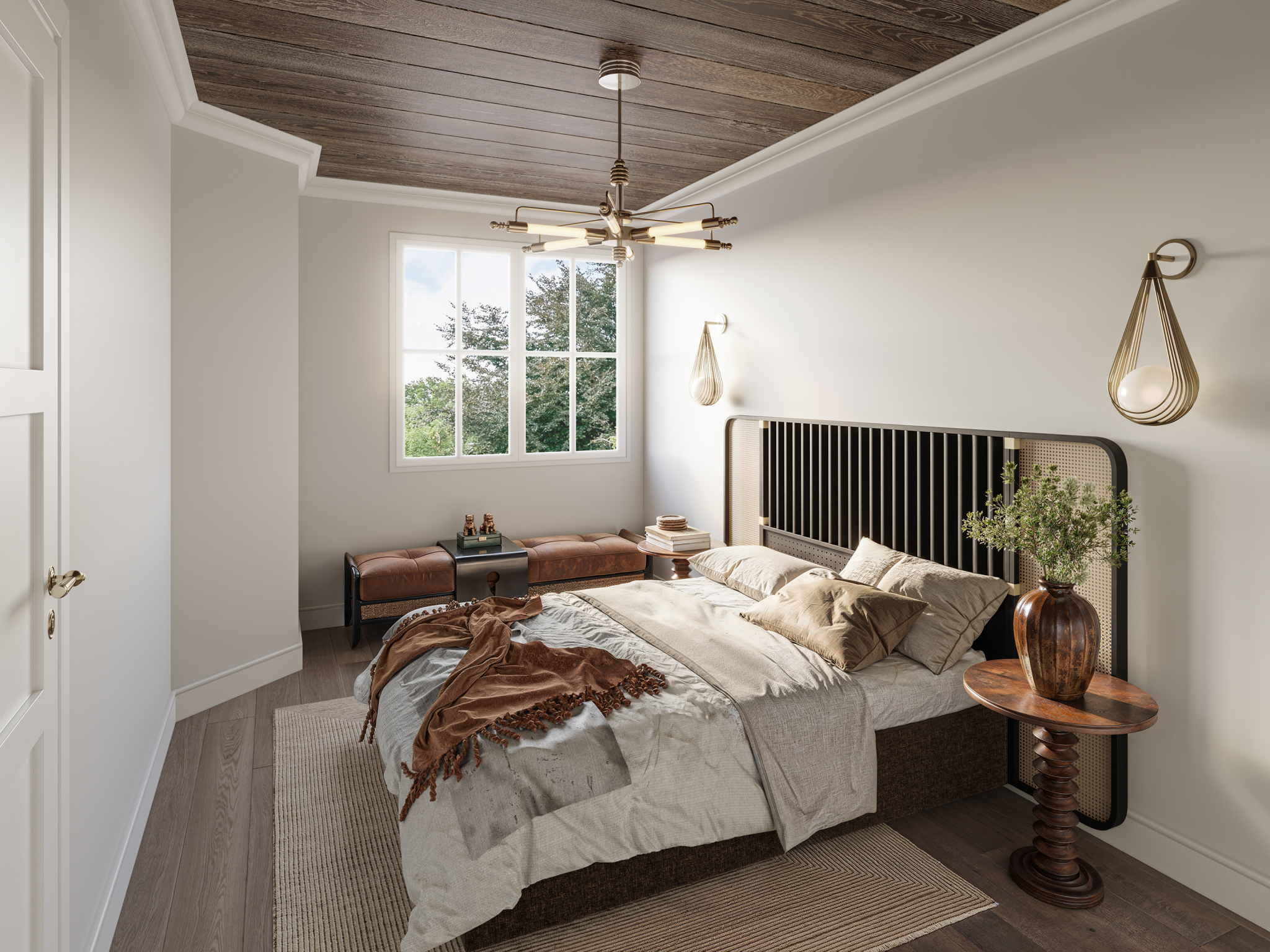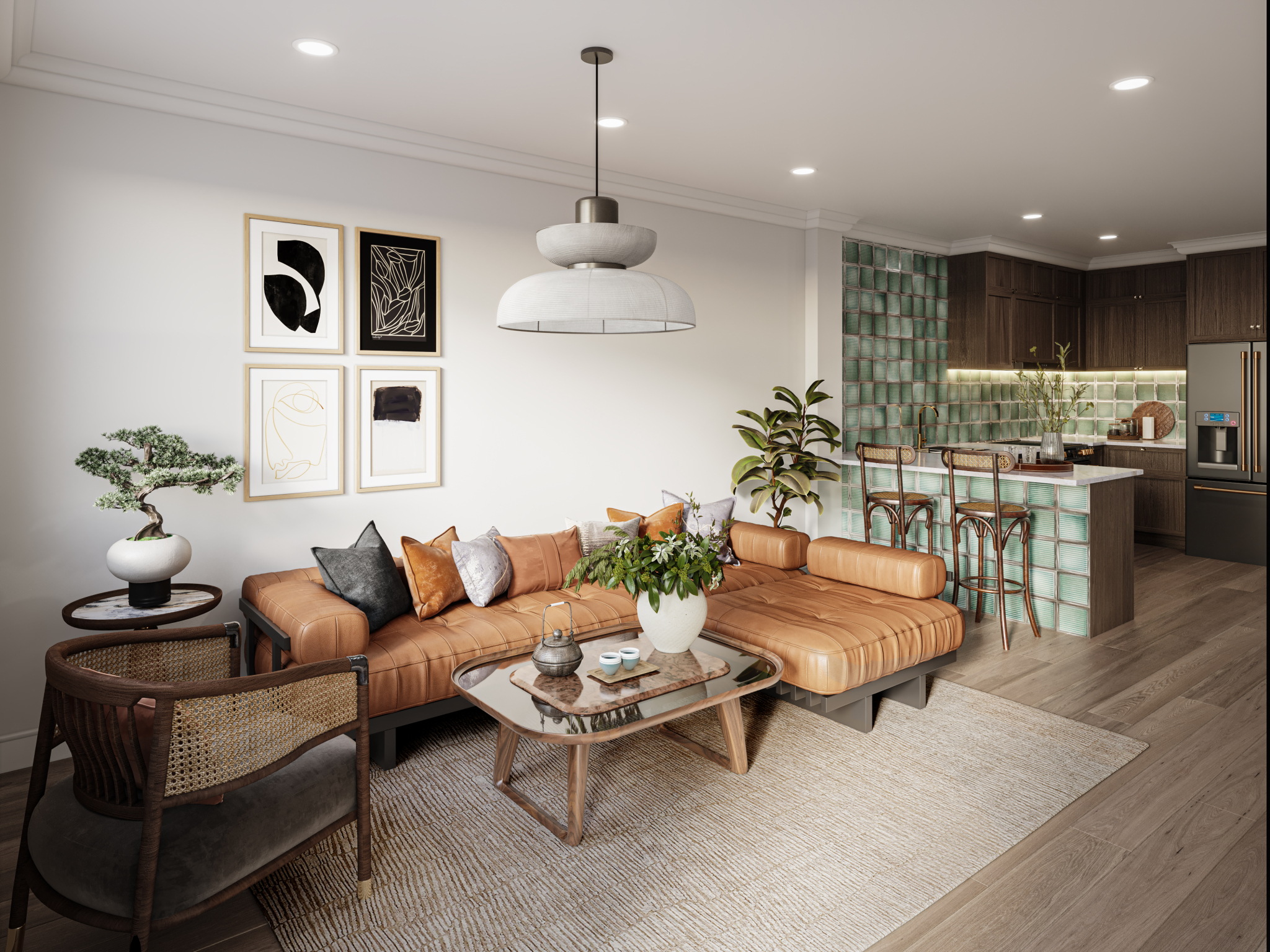 Natural light filters through soft textures and warm tones, connecting the living room and bedroom in a calm, cohesive flow. Leather, wood, and fabric come together with subtle color accents to create spaces that feel lived-in yet refined, comforting without losing elegance.