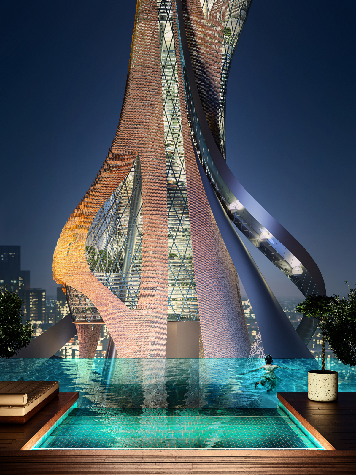 Inspired by the walled Medina, the tower reimagines traditional urban elements—such as courtyards, souks, and mosques—within a vertical context. It operates as a self-sustaining ecosystem with net-positive energy performance, regenerative water and waste systems, and integrated vertical farming.