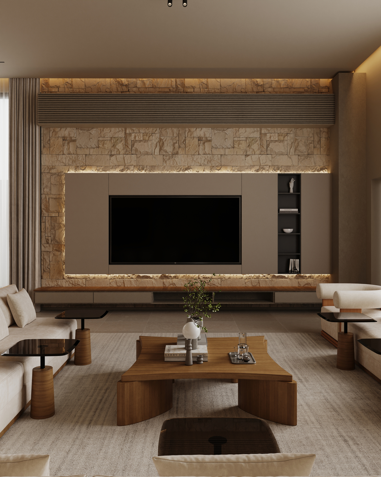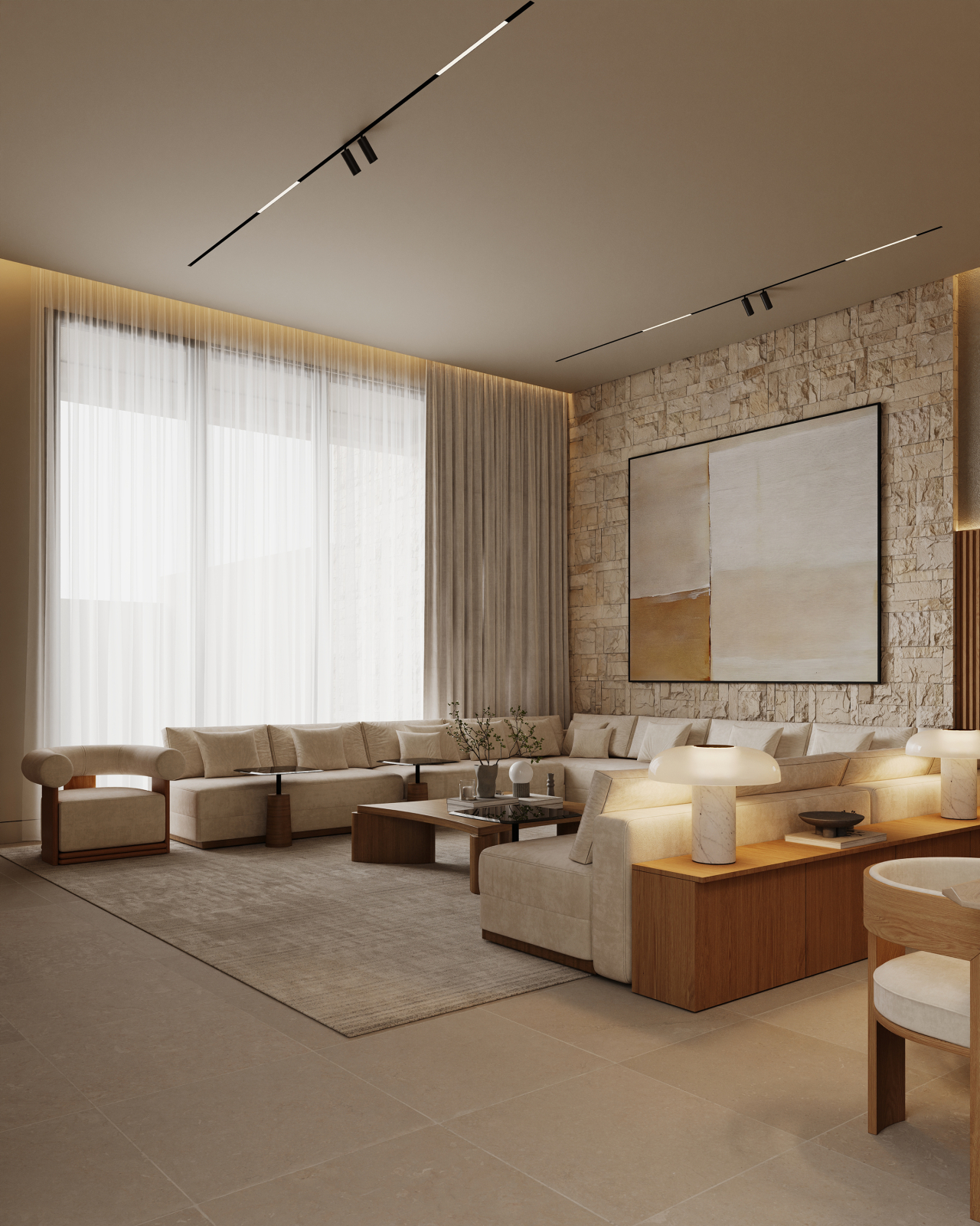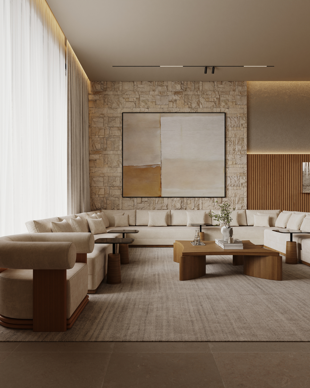 An elegant composition of natural textures and soft neutrals, where form, balance, and warmth define a timeless modern living space. Warm beige tones, soft fabrics, and gentle lighting come together in perfect
