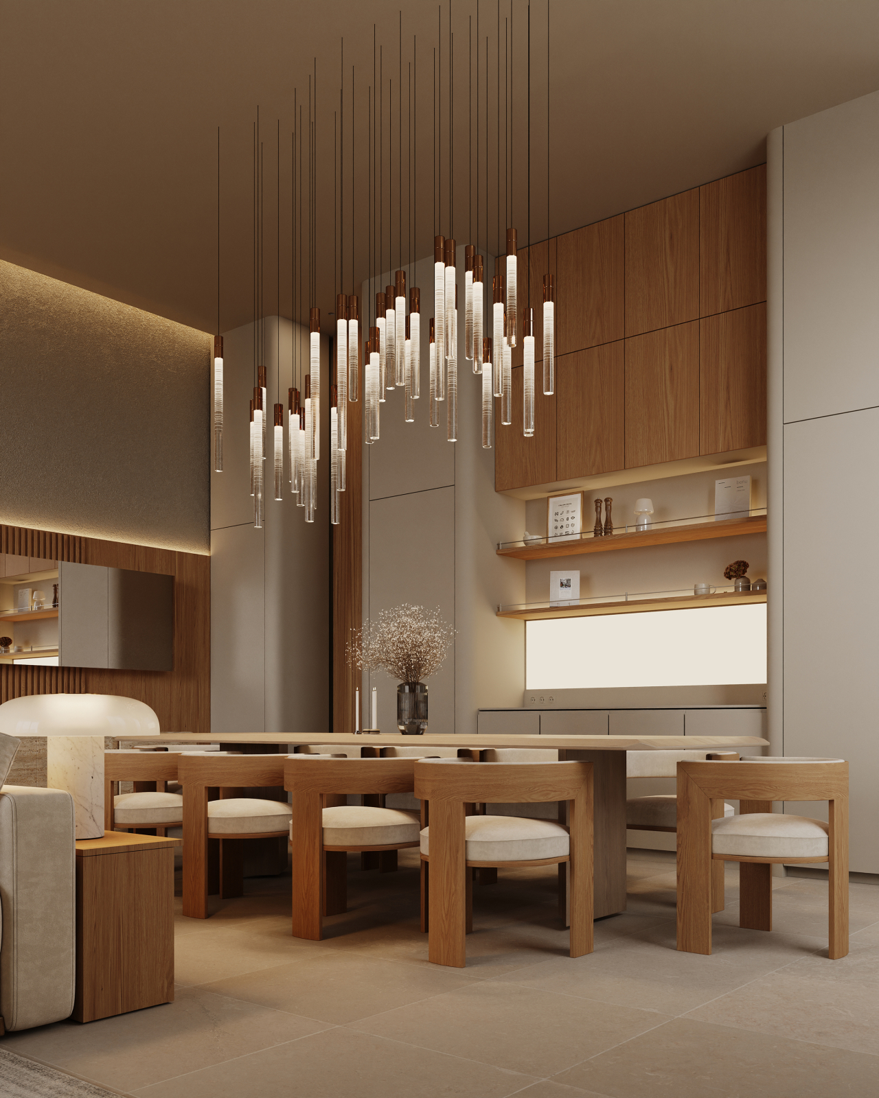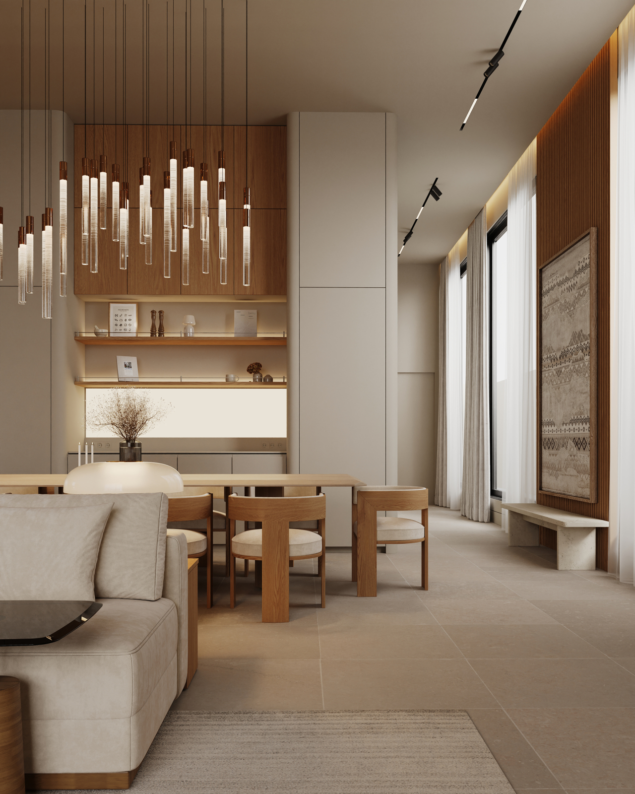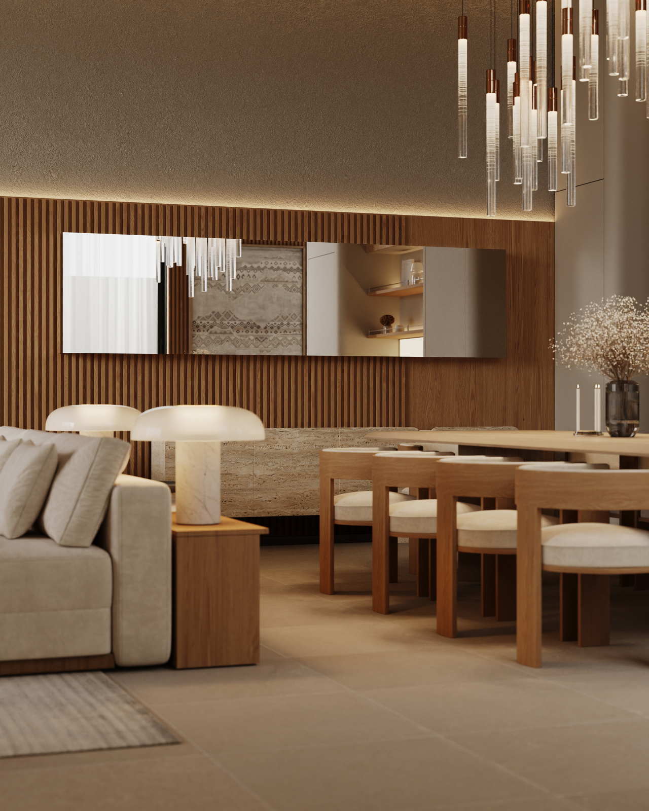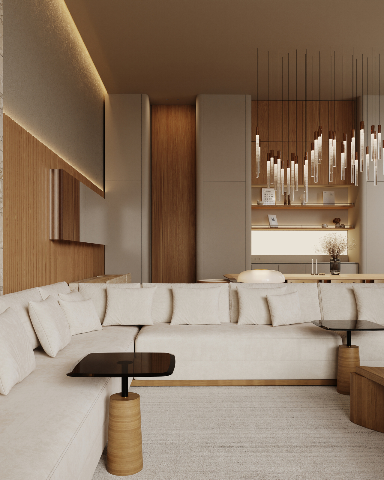 An elegant composition of natural textures and soft neutrals, where form, balance, and warmth define a timeless modern living space. Warm beige tones, soft fabrics, and gentle lighting come together in perfect