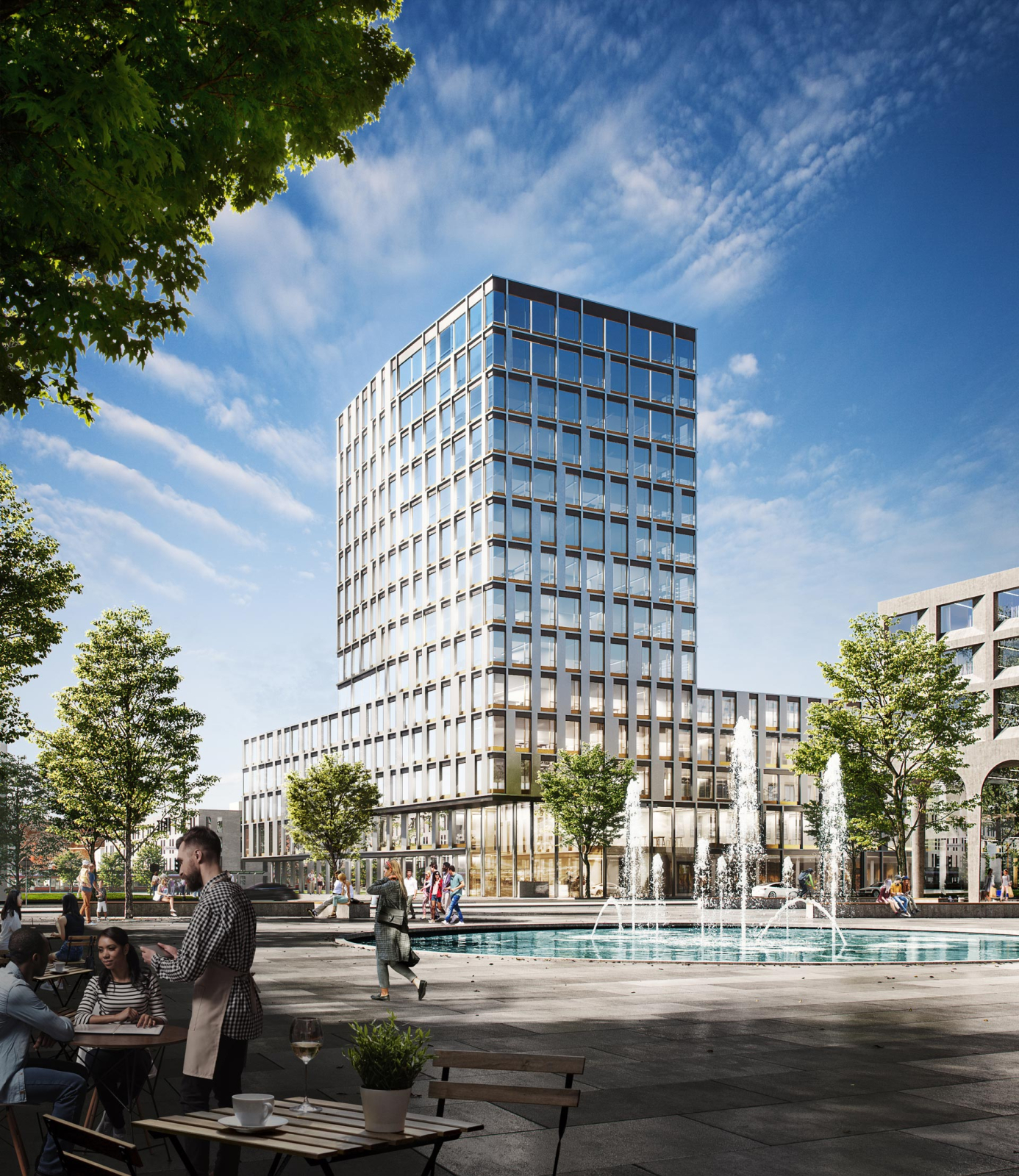 A careful balance between transparency and depth allows the architecture to create a dynamic, refined visual presence, enhanced by the consistent use of glass, metal, and light-toned surfaces. At ground level, active public uses extend the civic life of the plaza into the building, while the upper floors accommodate flexible, light-filled office spaces, offering generous glazing and panoramic views across the city.