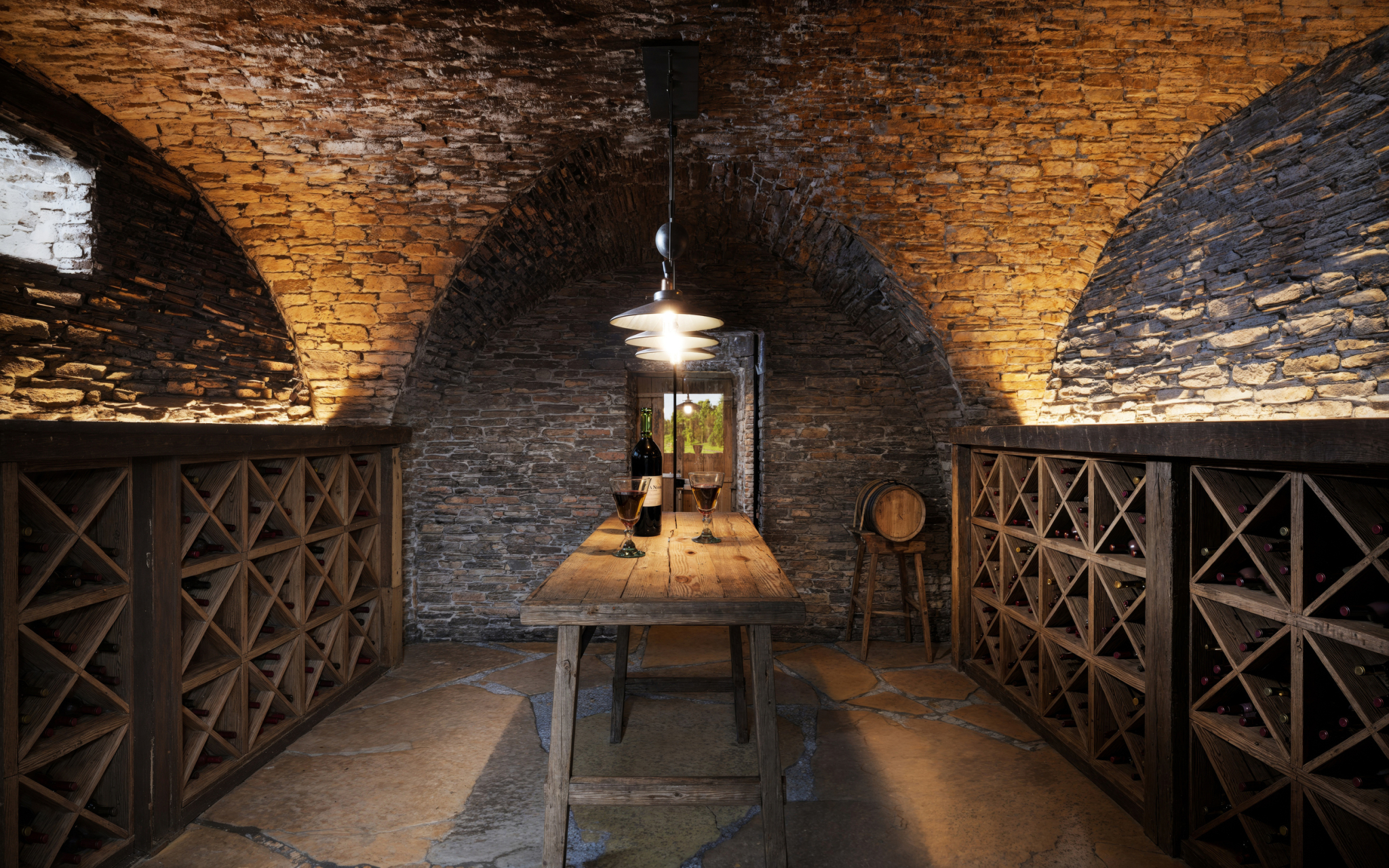 At the heart of the home lies a preserved historic wine cellar. With authentic stone masonry and rustic wooden shelves, it retains its original charm, offering a space filled with history, mystery, and the perfect setting to enjoy wine and the stories it holds.