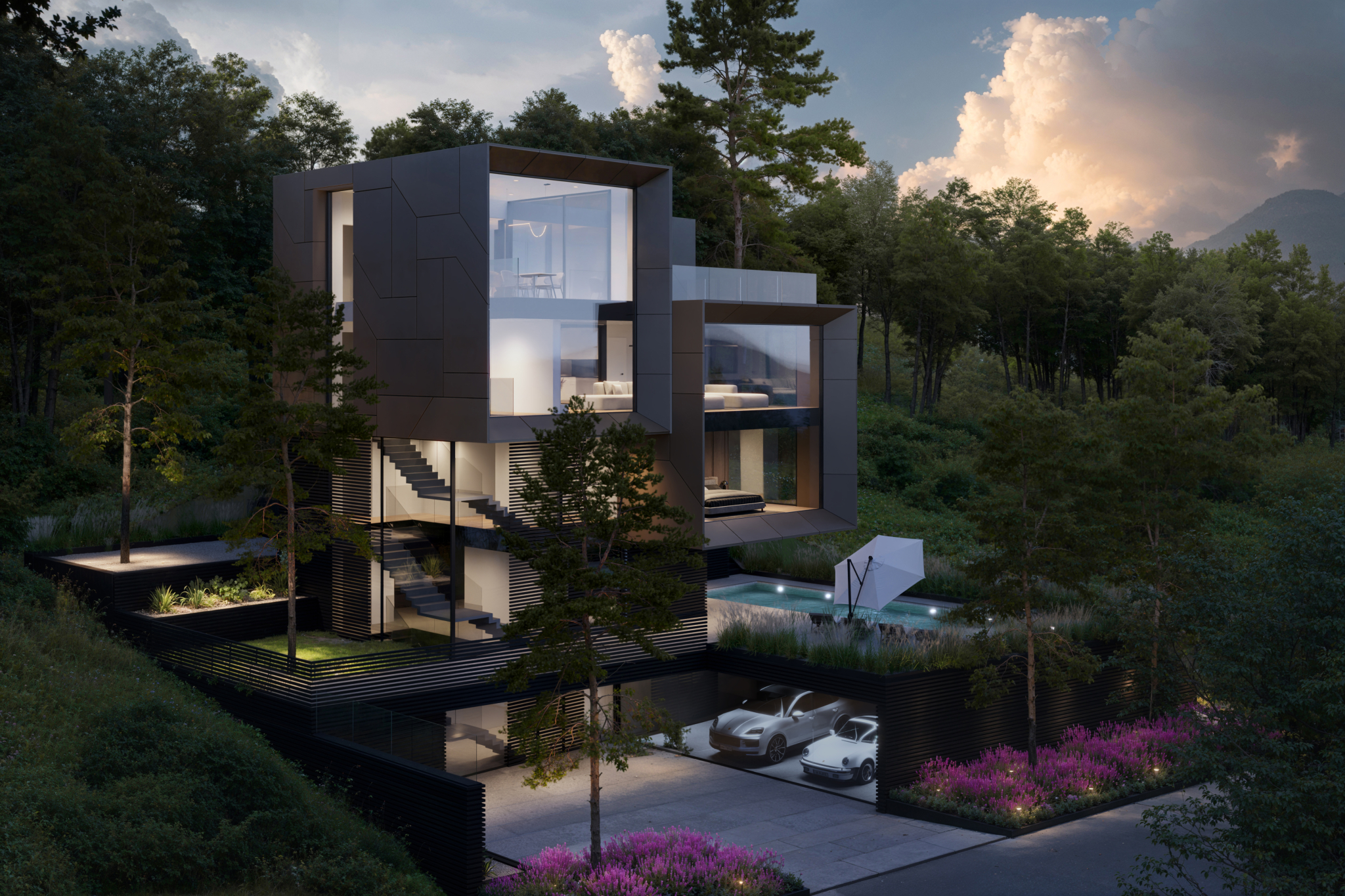In this 3D rendering, we focused on the distinctive features of this residence in Zug: modern geometry, generous glazing, and high-quality materials. We also highlighted its seamless integration into the landscape — with panoramic views, natural contours, and greenery that softens every edge.