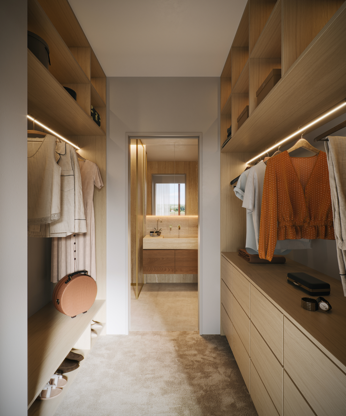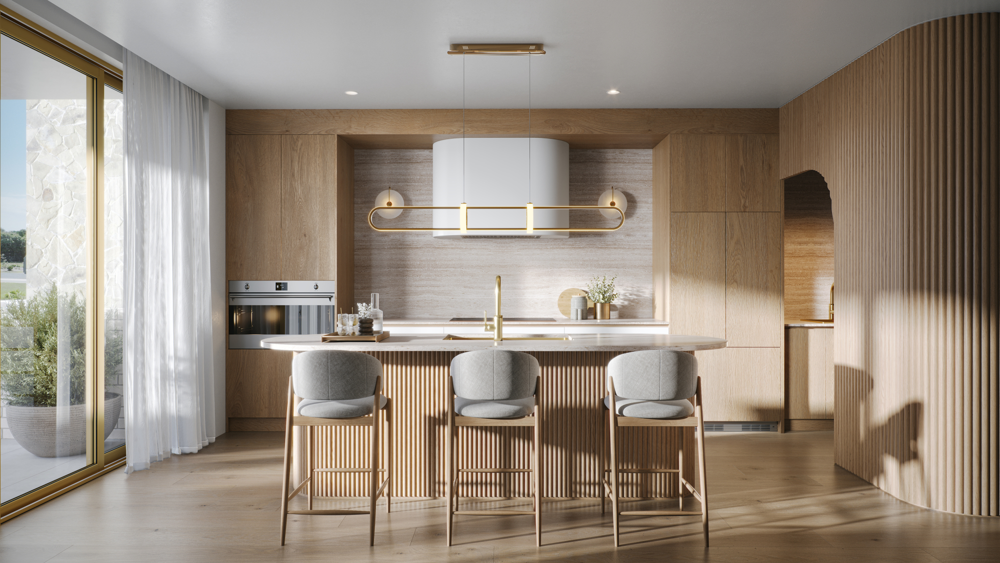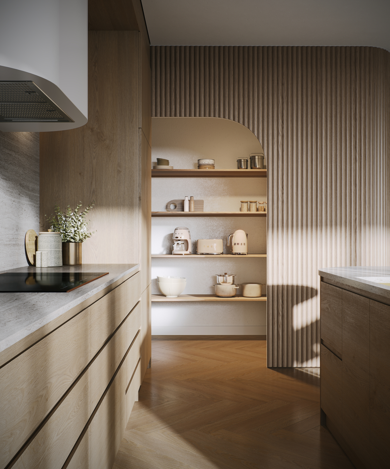 Open shelves introduce a lived-in and personal feel, while the layout keeps the kitchen practical and elegant. Every surface, shadow, and material is designed to reflect the atmosphere of a home close to nature — relaxed, tactile, and truly warm.