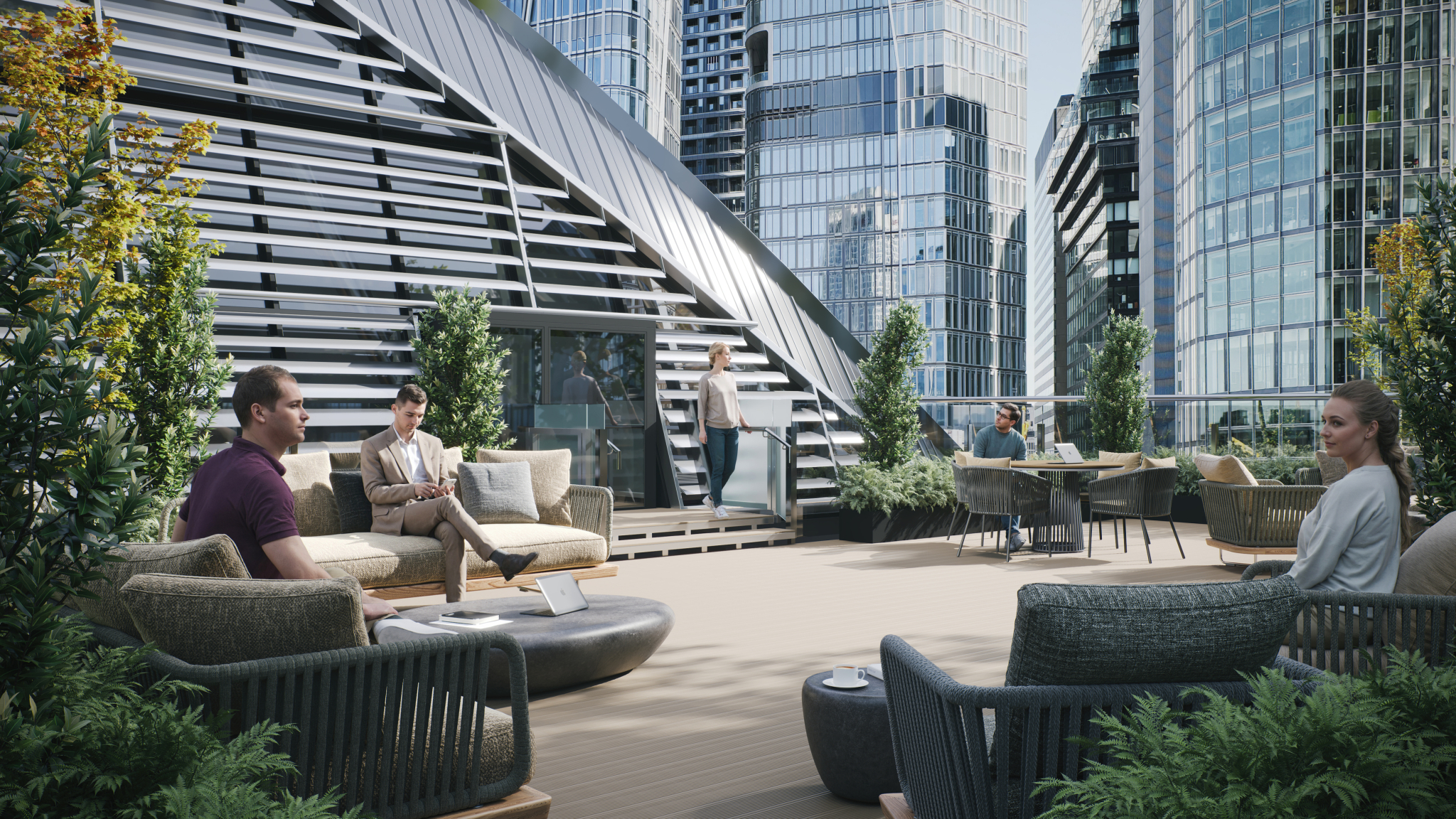 These visualizations focus on shared amenity spaces and modern work environments: a rooftop terrace, a lounge café, and an open office setting shaped by daylight, greenery, and flexible zones for collaboration and focus.