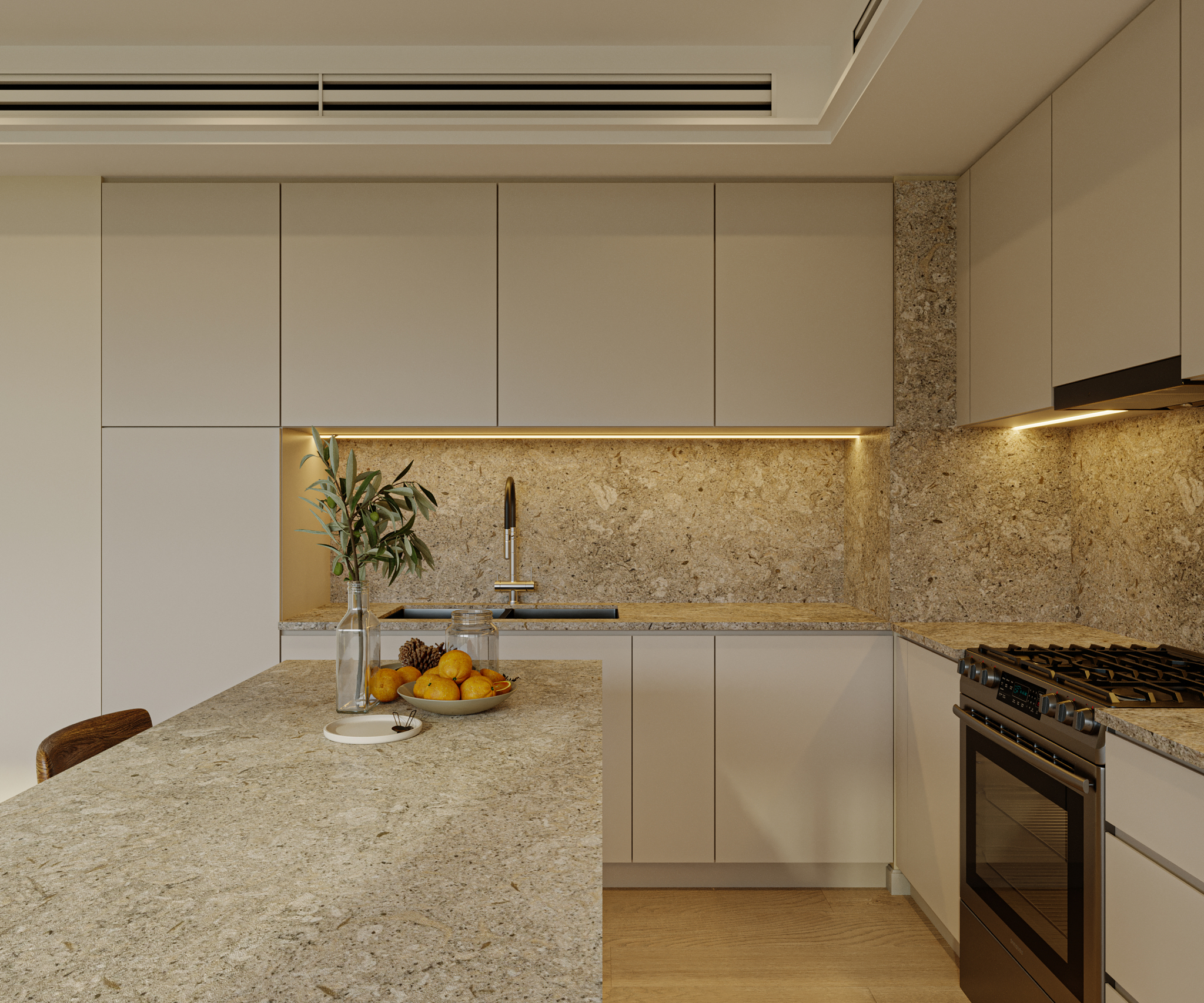 The Beach house interior design features a harmonious blend of natural materials, including exposed stone walls, dark wood accents, and neutral-toned furnishings.
