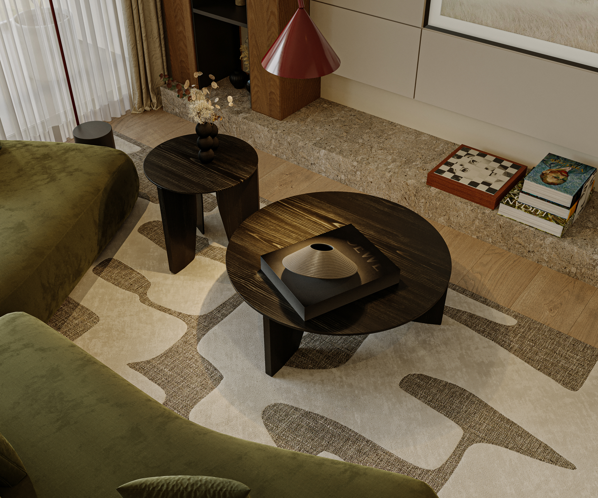 Welcome to a space where furniture transcends function to become sculpture. This living area was designed as a study in tactile contrast—pairing high-gloss, avant-garde art with the grounded, earthy comfort of