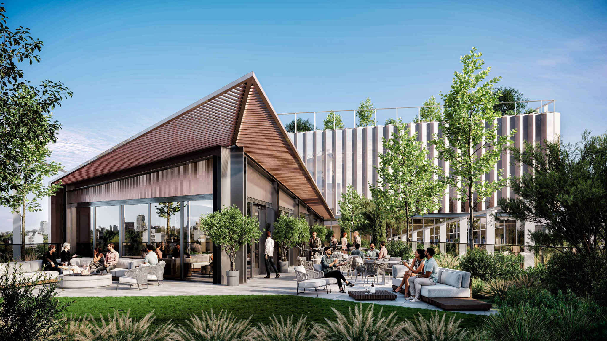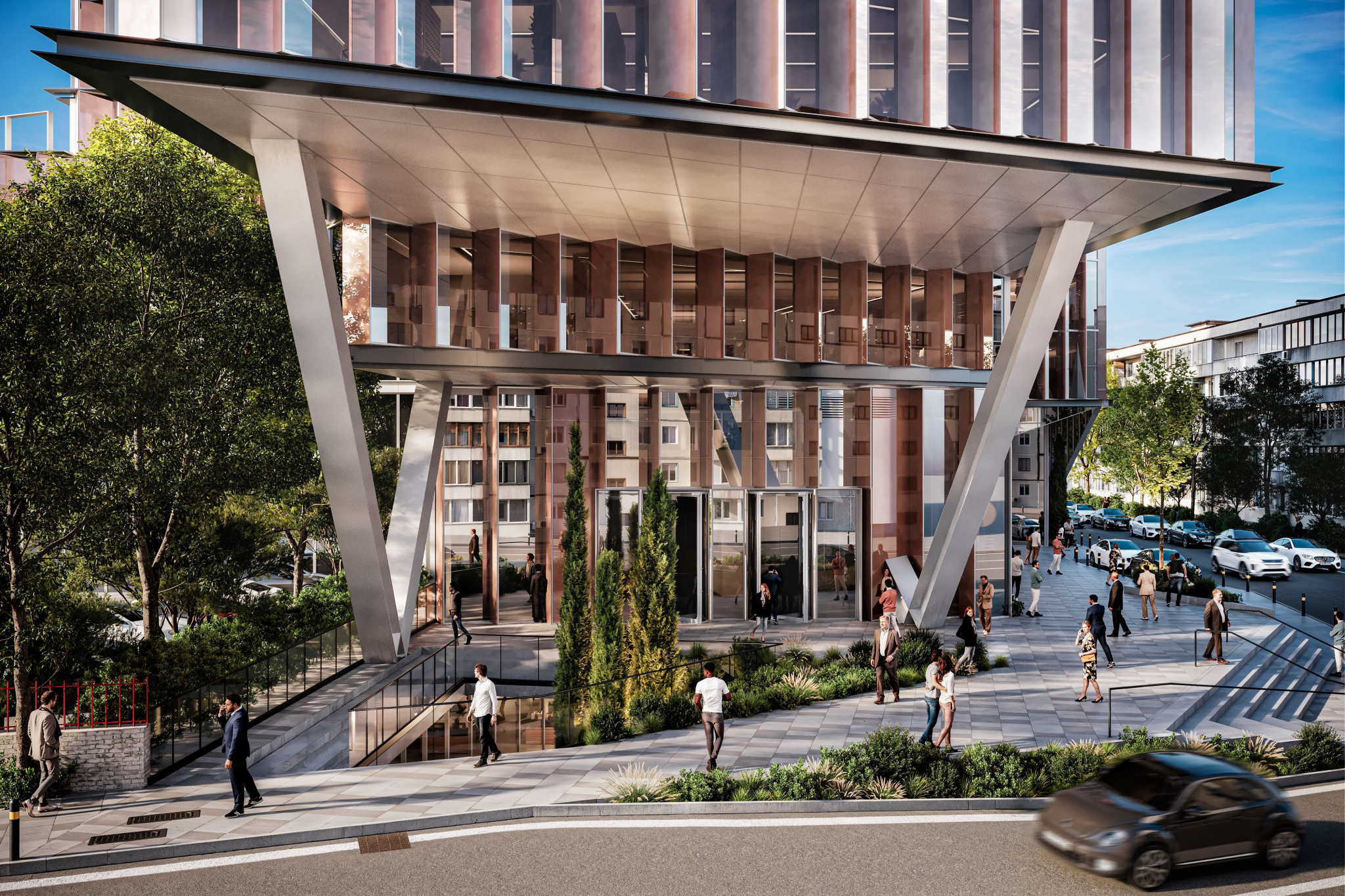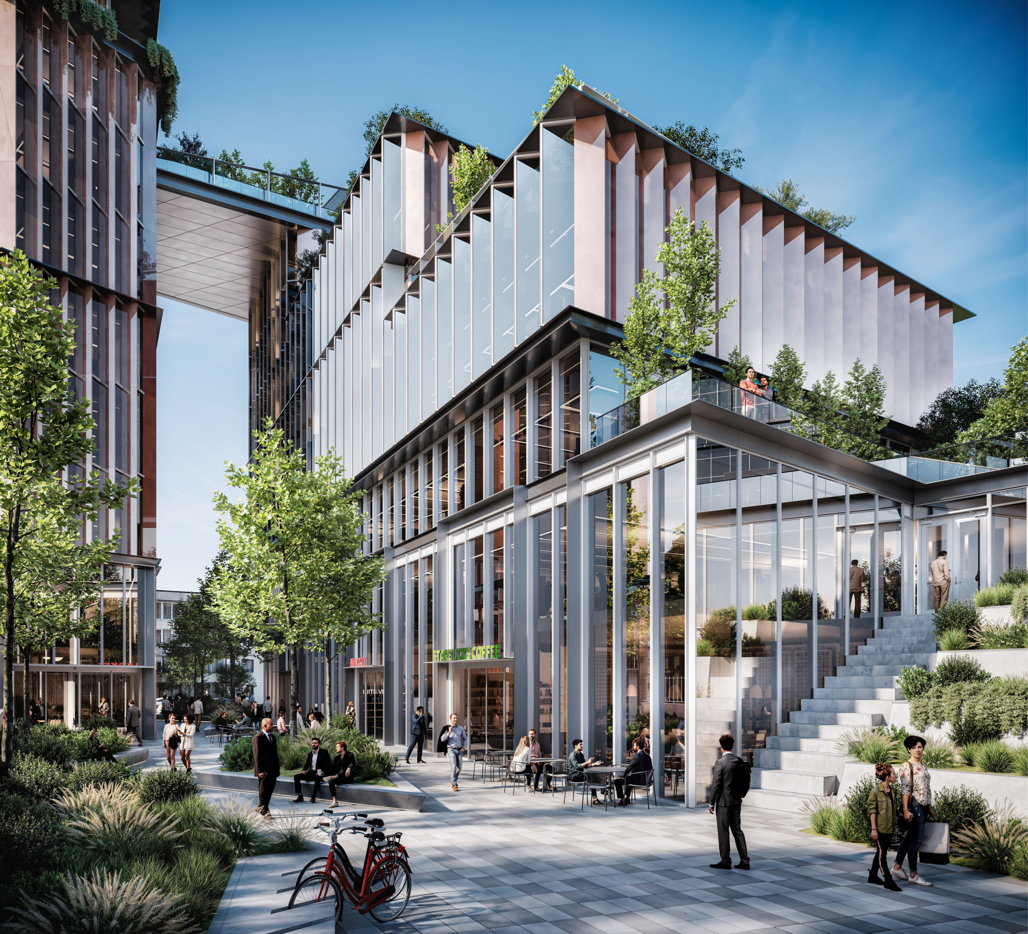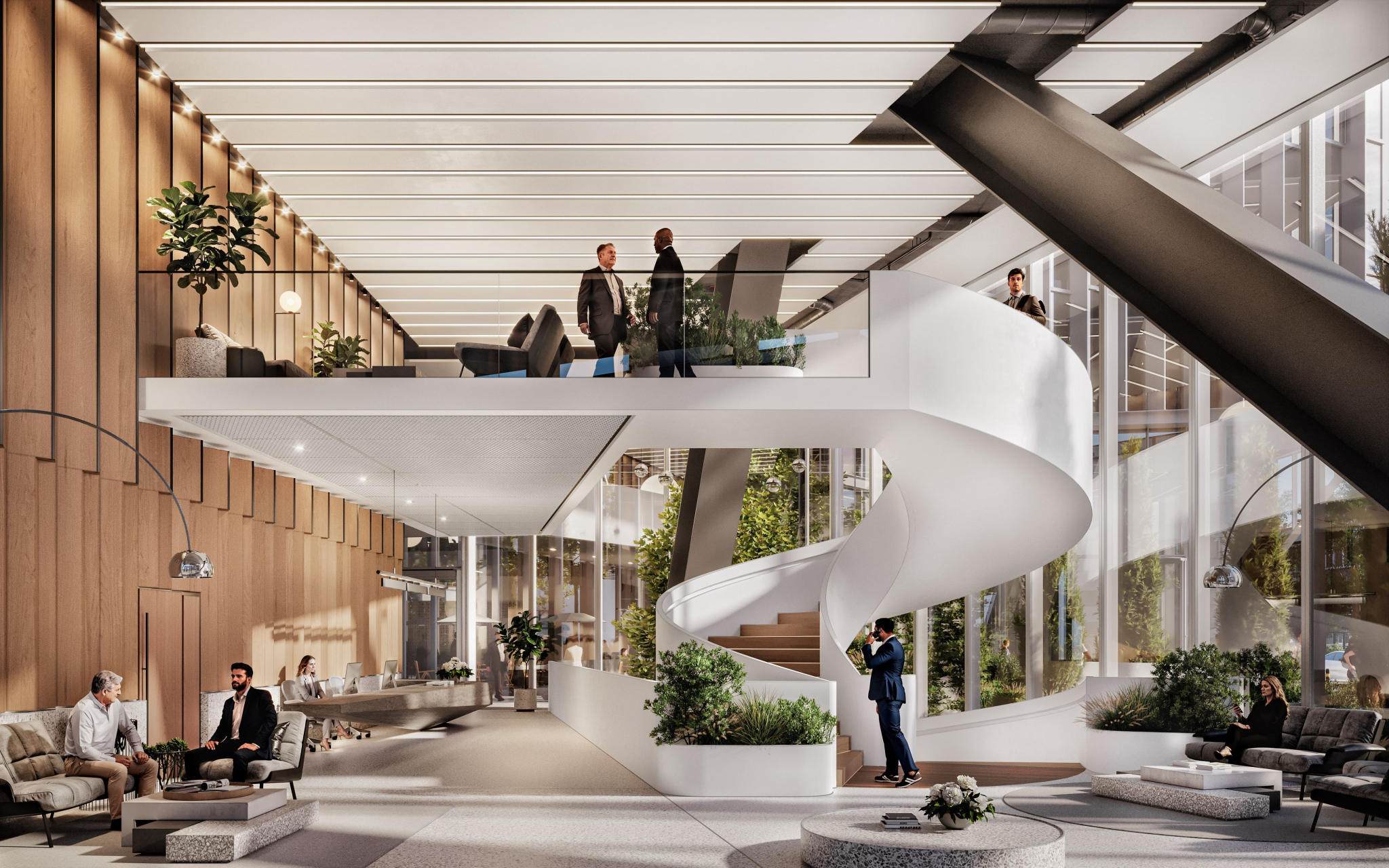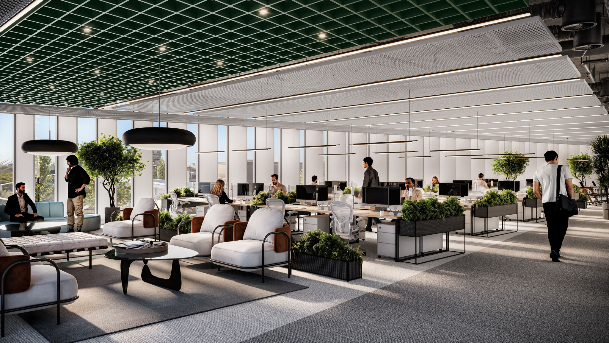 Green mid-rise office in Nicosia with a sky bridge, biophilic design and open spaces. Our studio visualized the architect’s concept and made CGI shots in different light conditions and from different angles.