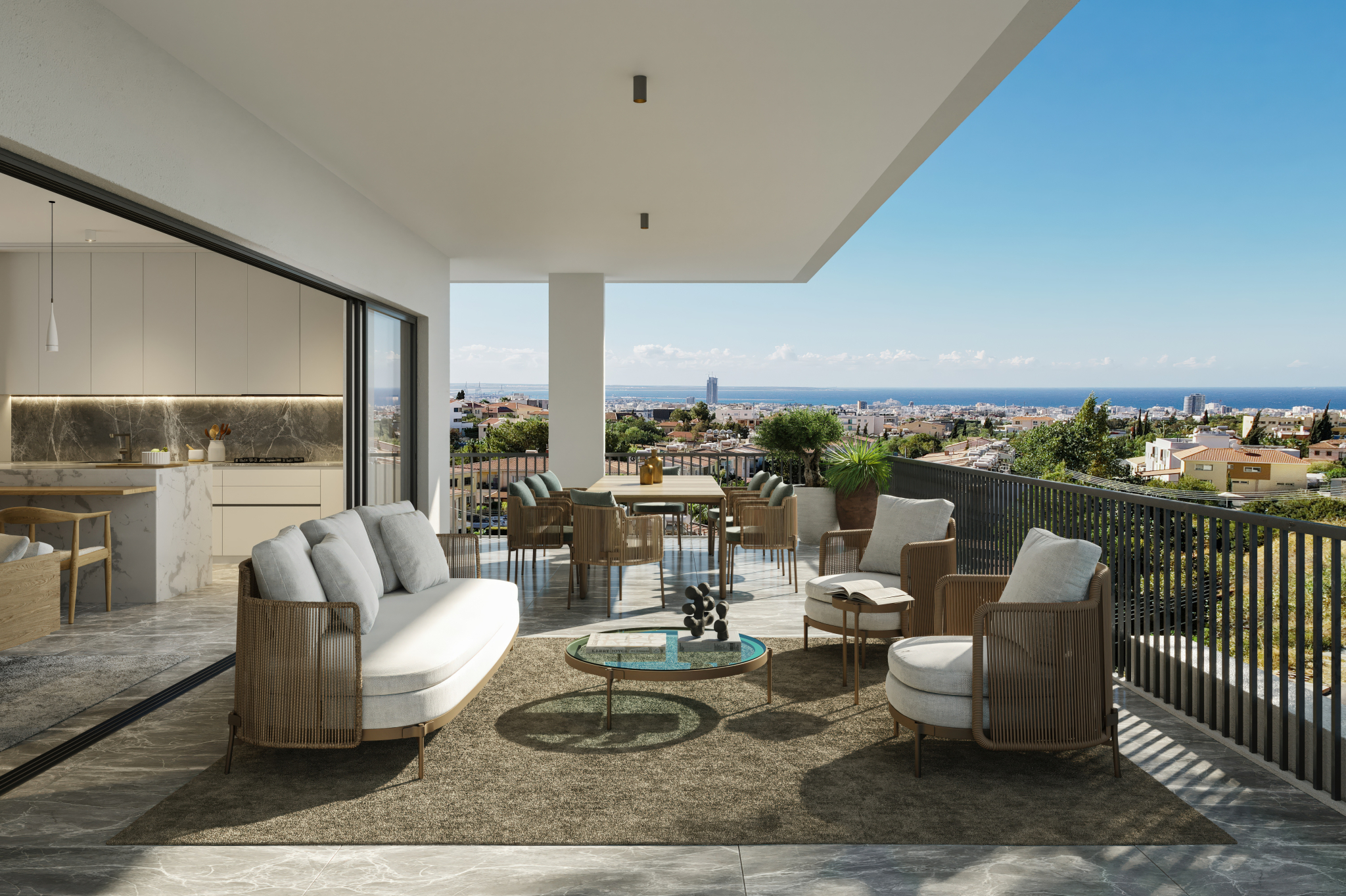 The Nest , a modern flat complex with sinuous balconies and a shaded terrace in Nicosia. Our studio visualized the architect’s concept and made CGI shots in different light conditions and from different angles.